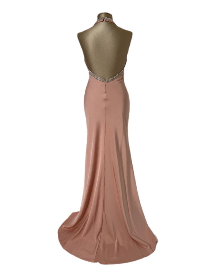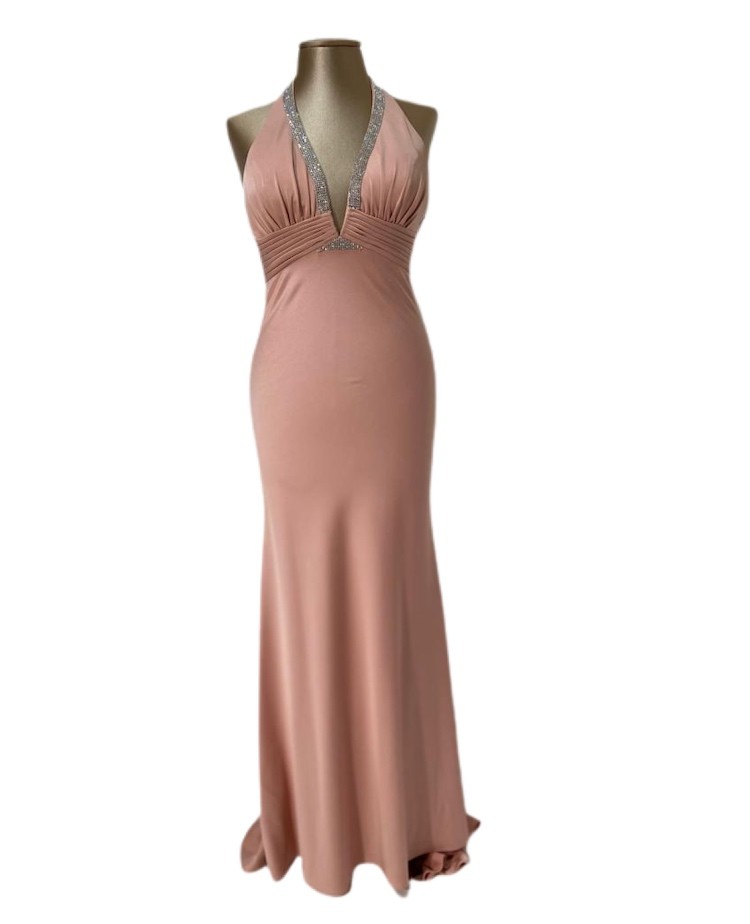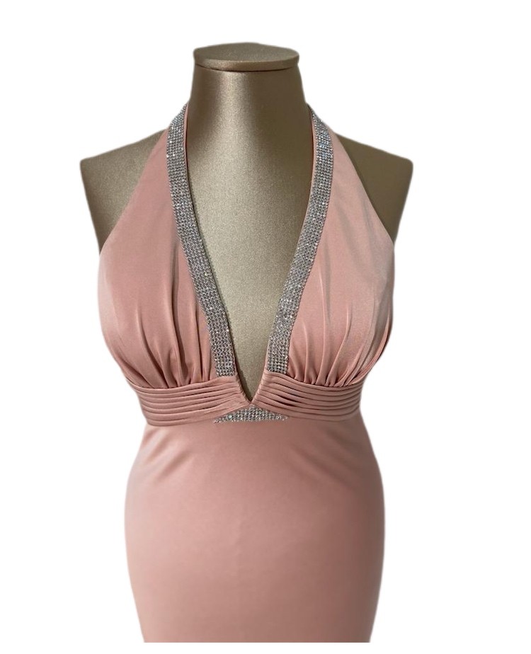 abito cerimonia rosa cipria con profonda scollatura contornata da swarovski luminosi