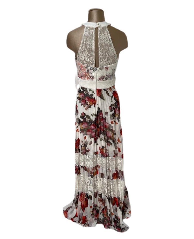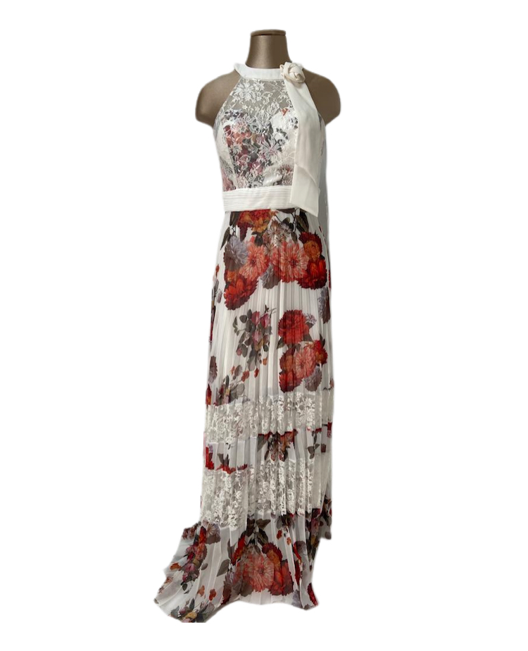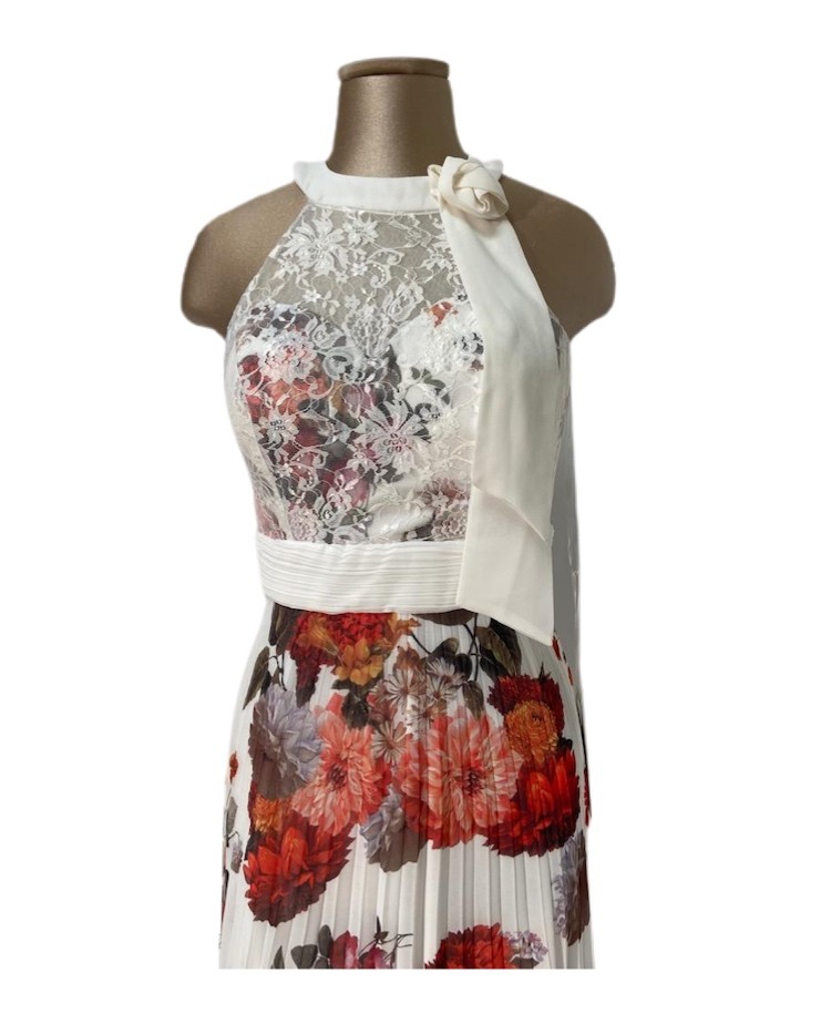 gonna plissettata con stampa floreale e trasparenze di pizzo che richiamano il corpetto