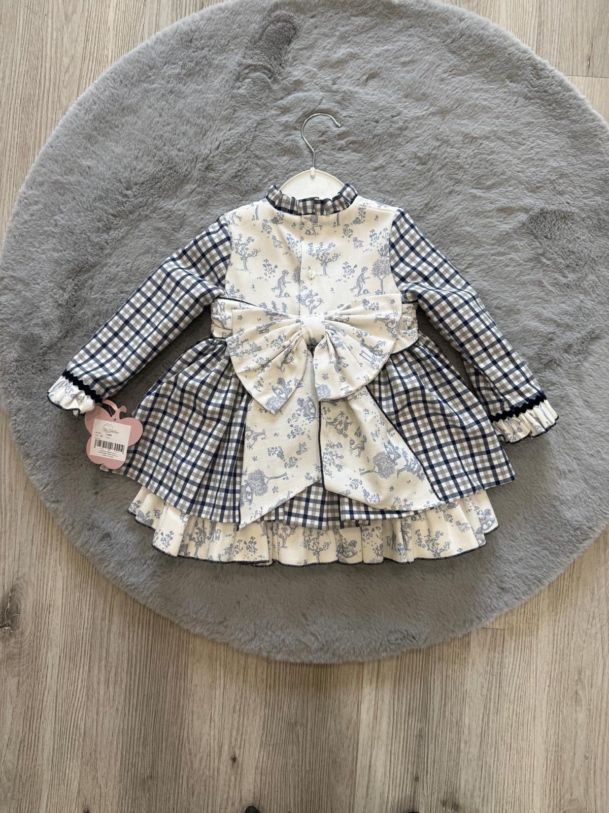 Un abito raffinato dal gusto senza tempo, perfetto per cerimonie, occasioni speciali o eventi importanti. Il modello combina con armonia una delicata fantasia toile de jouy nei toni del panna e azzurro con un elegante motivo a quadretti blu, creando un look romantico e ricercato.