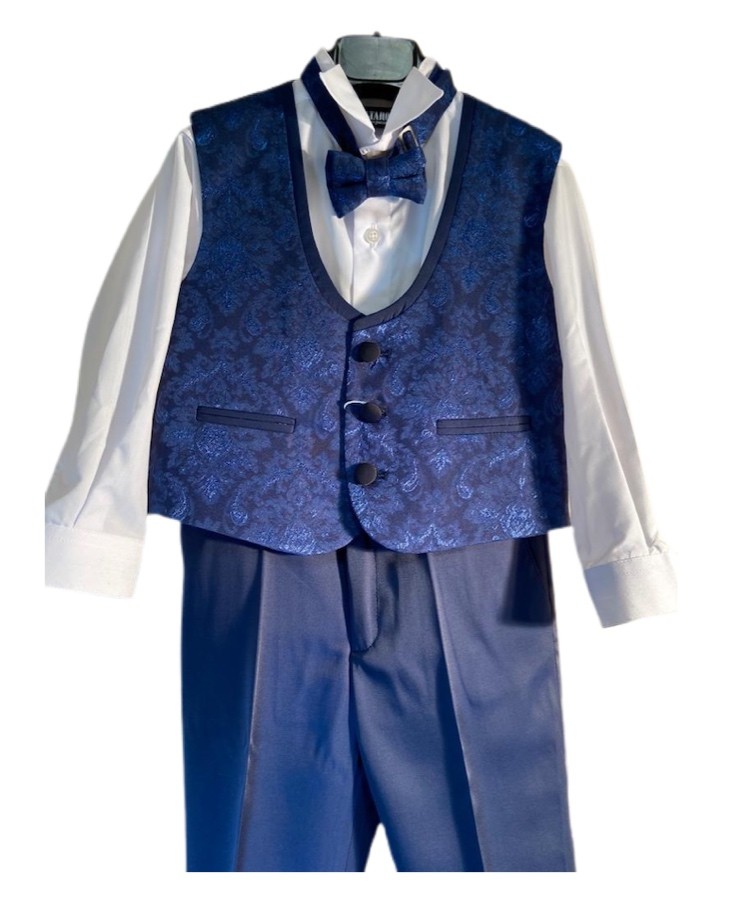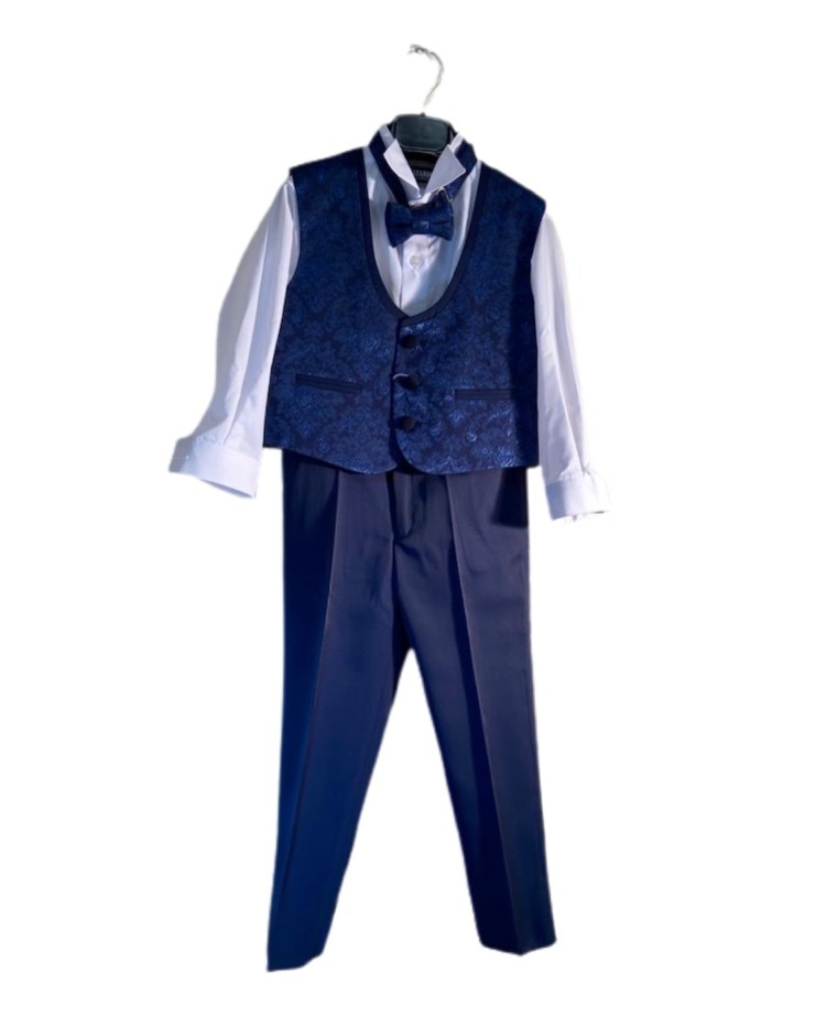 Abito neonato completo di: Camicia, pantalone, gilet e papillon. Il gilet si presenta in blu elettrico damascato coordinato al papillon. Pantalone tinta unita blu.