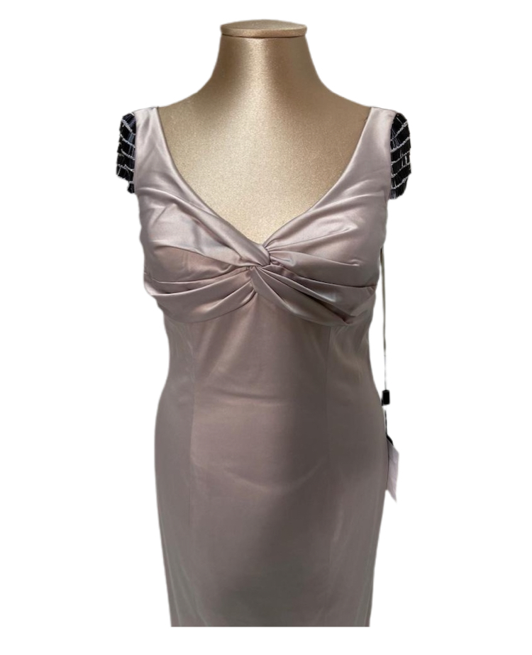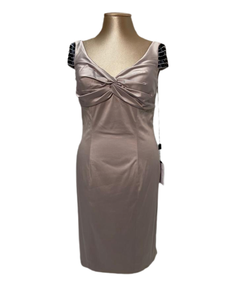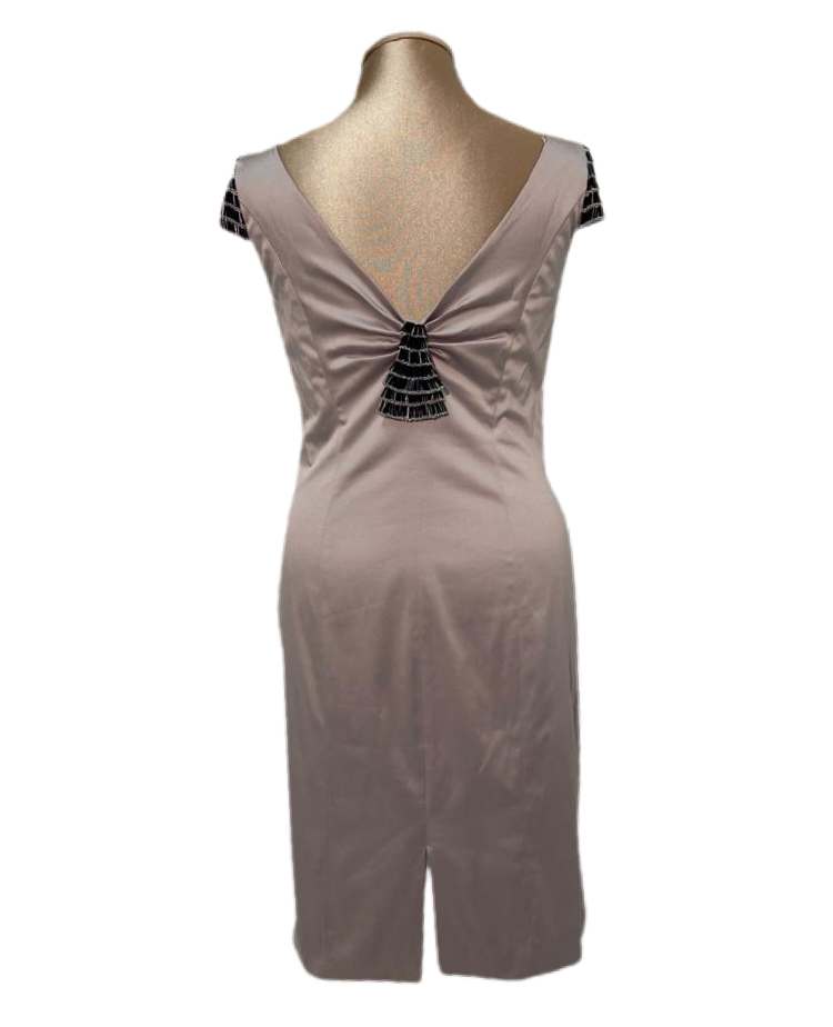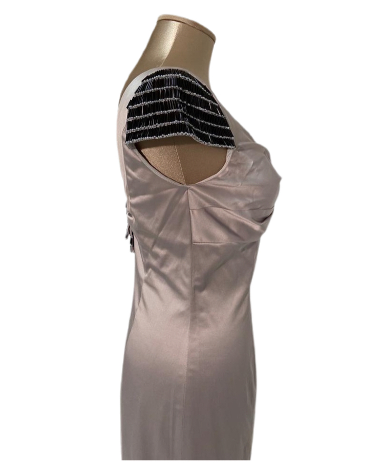 tubino elasticizzato color grigio perla con applicazioni sulla spalla e sul resto.