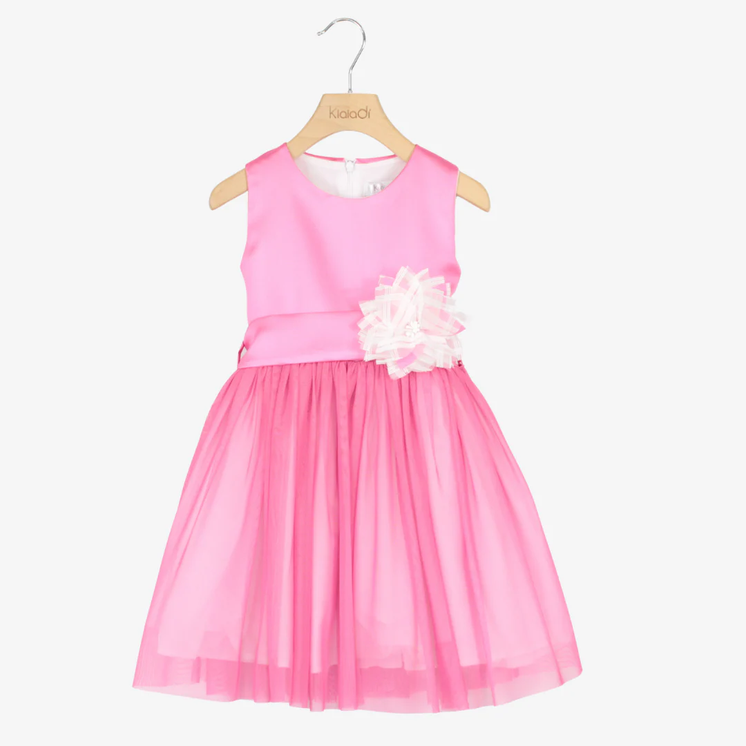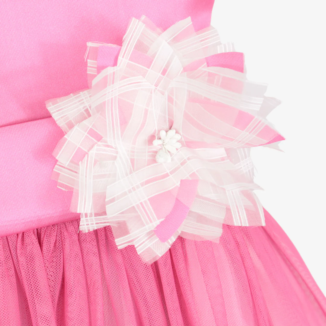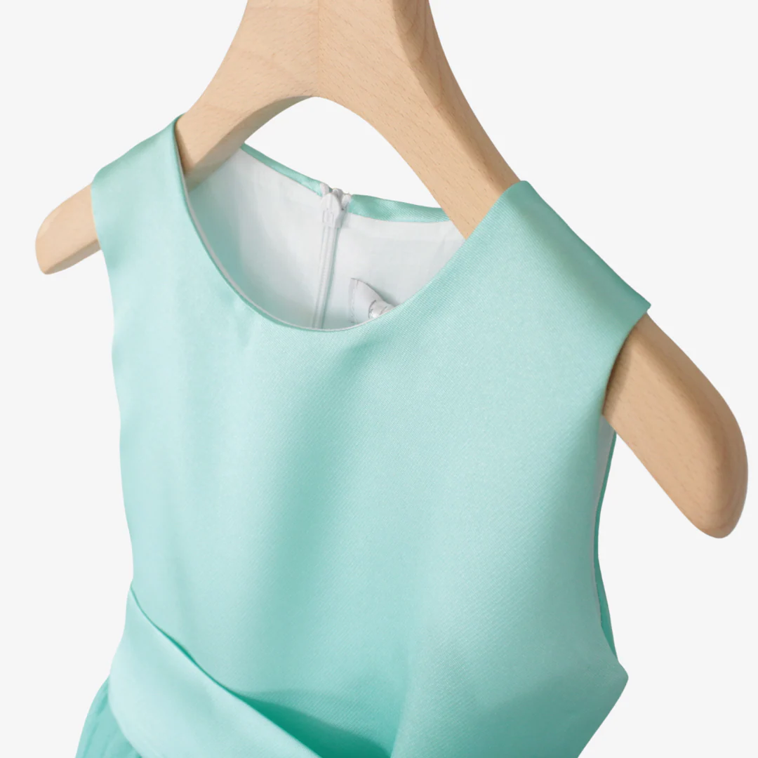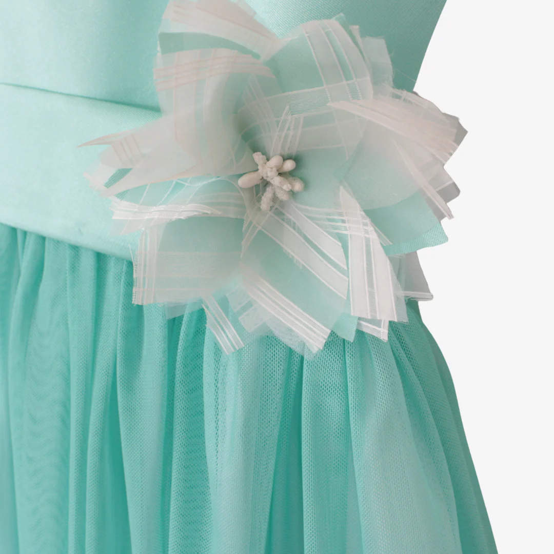 Perfetto per occasioni speciali, questo raffinato abito da cerimonia per ragazza unisce eleganza e comfort. Il corpetto in rasatello dona un tocco di lucentezza, mentre la gonna in tulle leggero crea un effetto principesco. La cintura con fiocco e fiore aggiunge un dettaglio romantico e sofisticato.