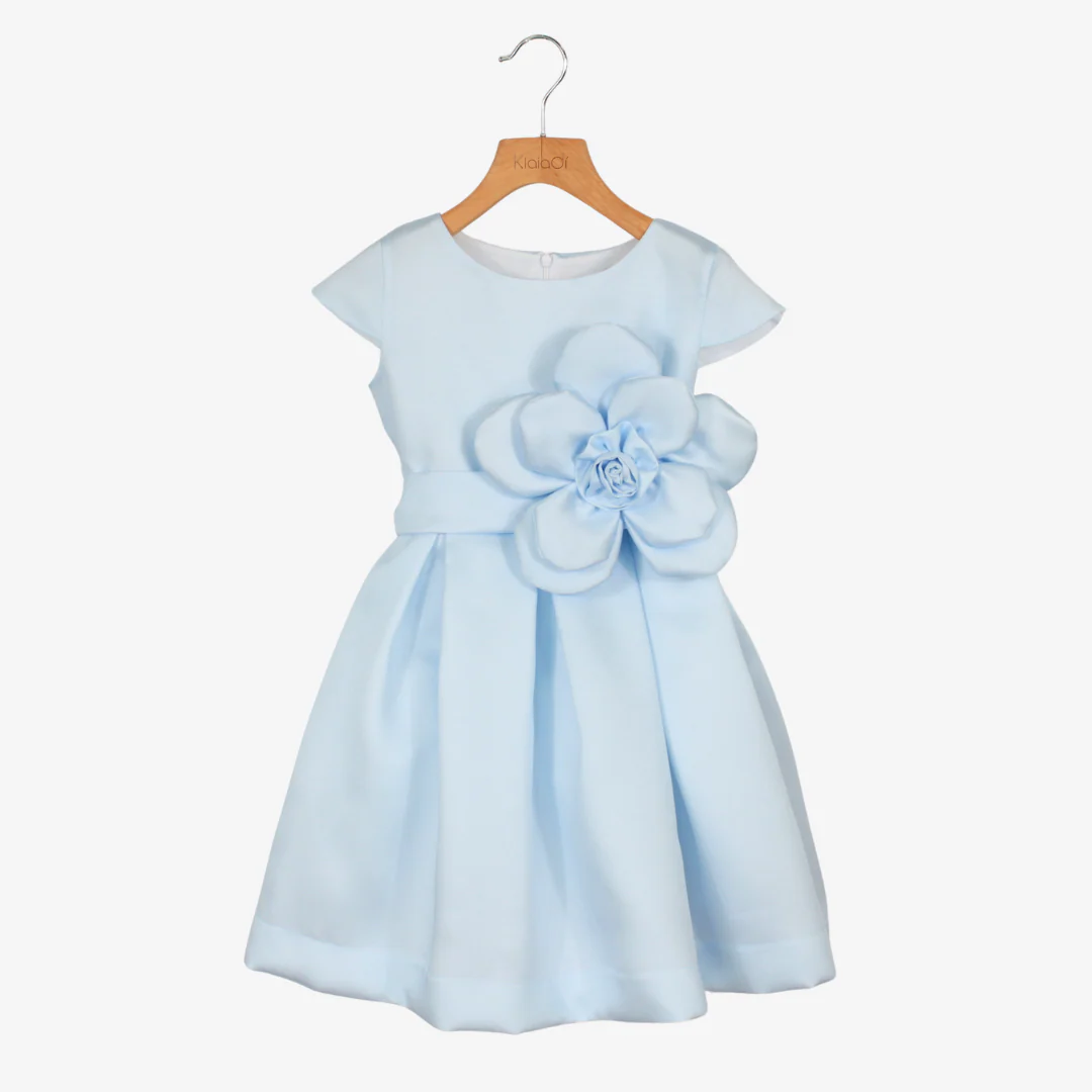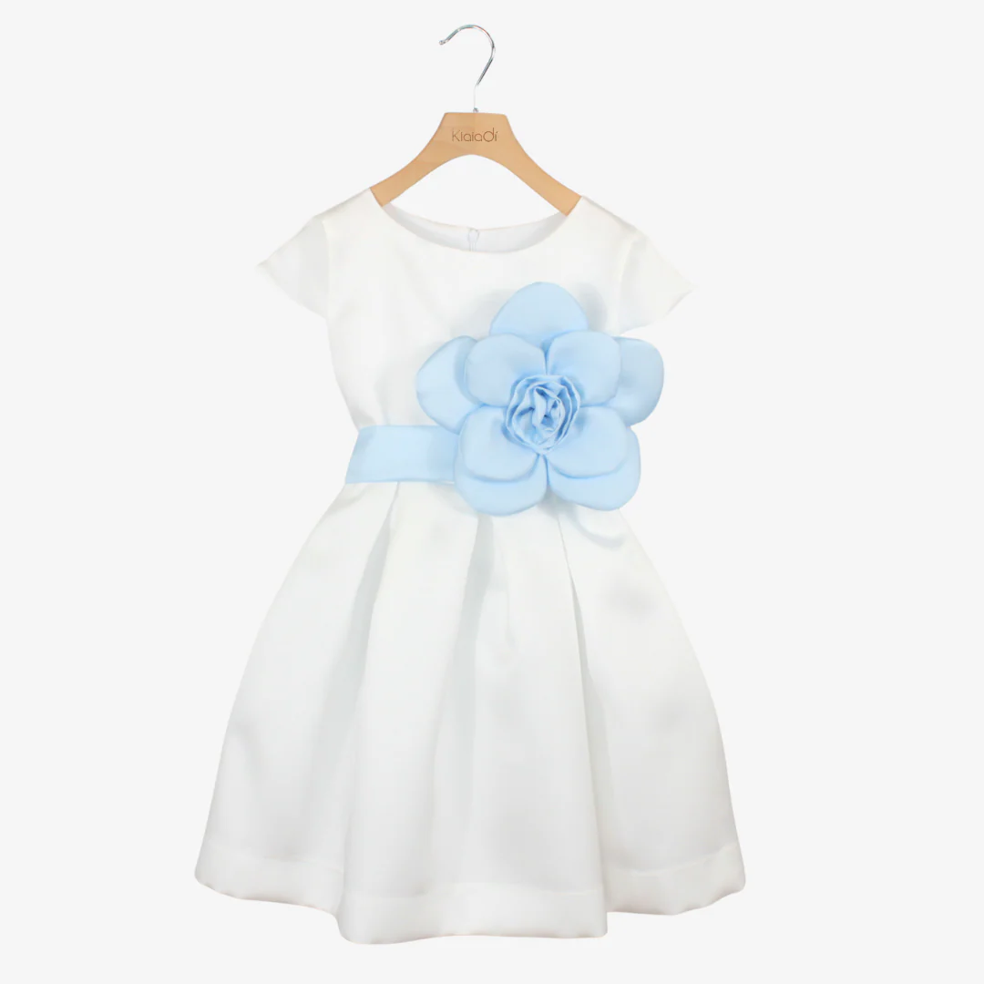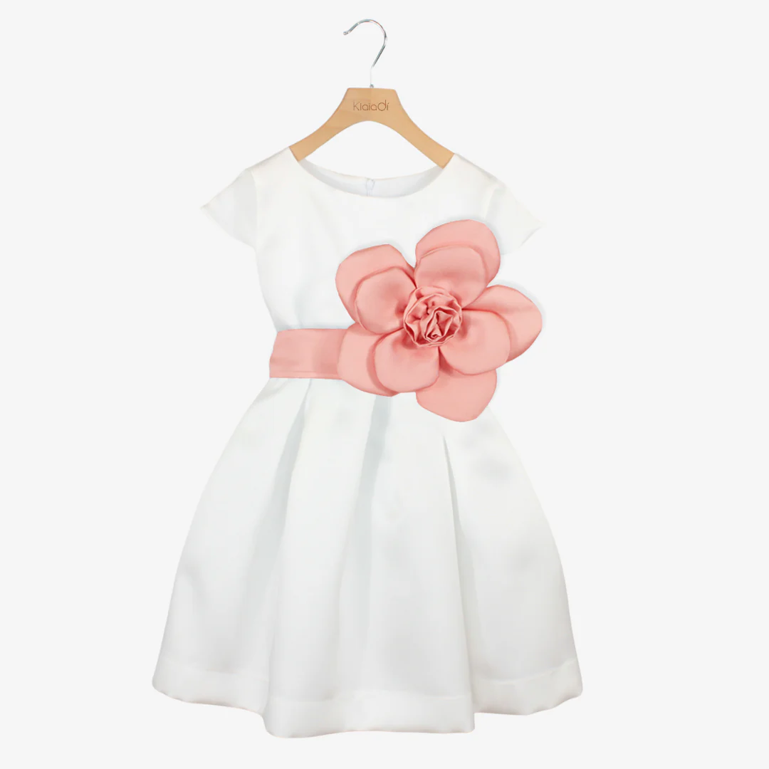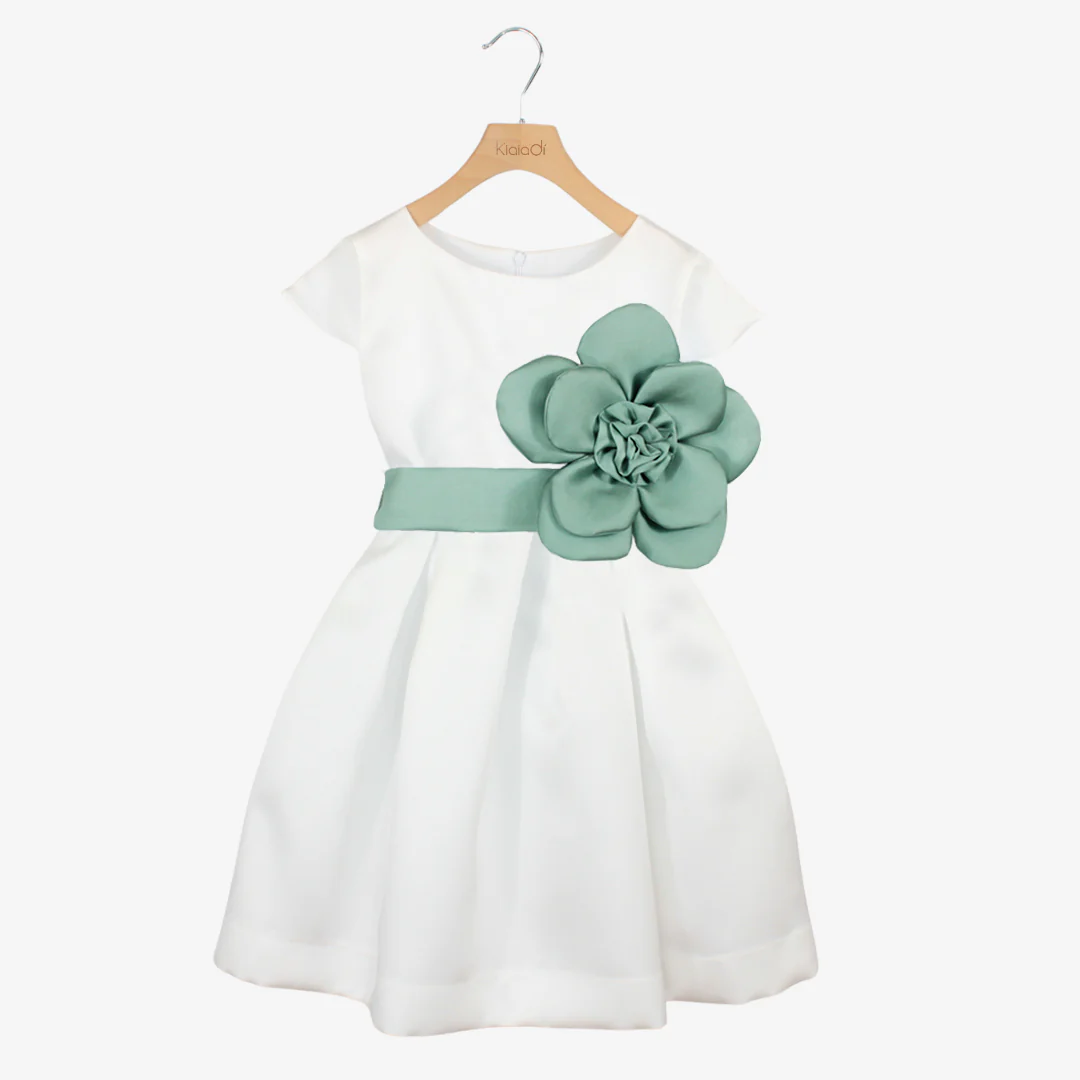 Elegante abito da cerimonia per bambine e ragazze, perfetto per occasioni speciali. Realizzato in mikado, offre una vestibilità raffinata e confortevole. La cintura è impreziosita da un ampio fiore applicato, aggiungendo un tocco di classe e romanticismo.