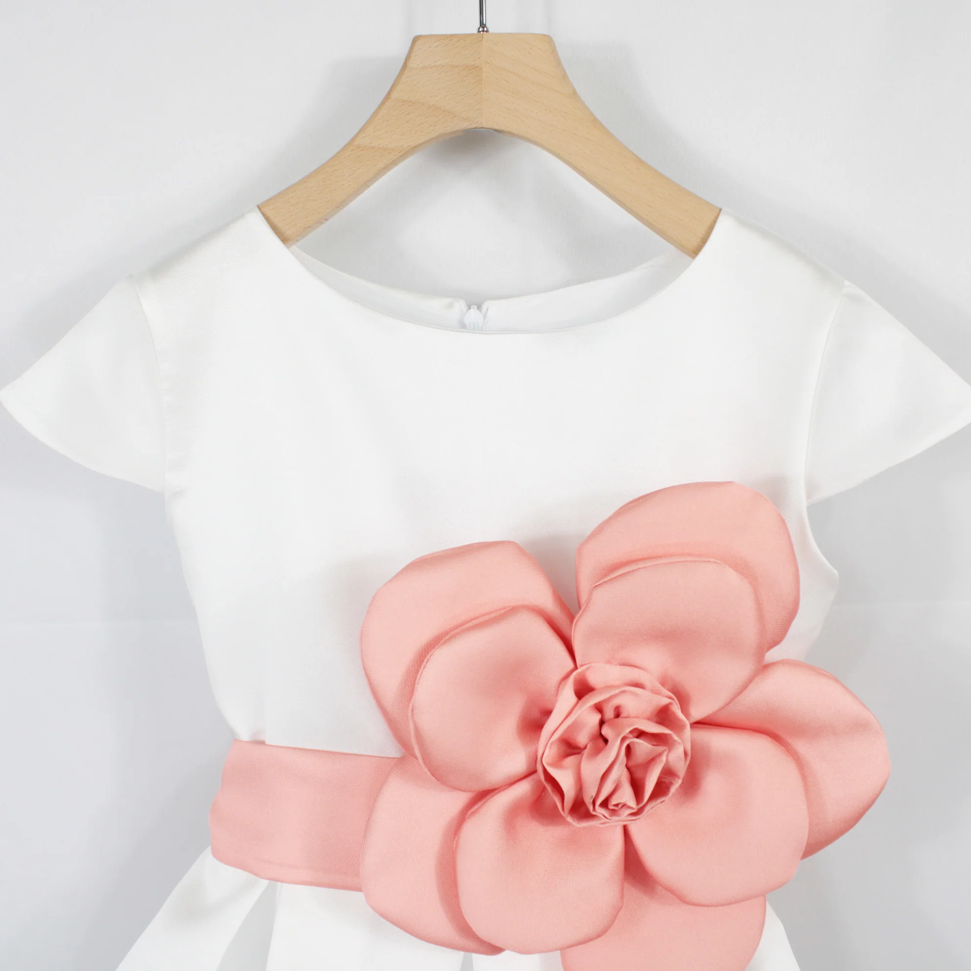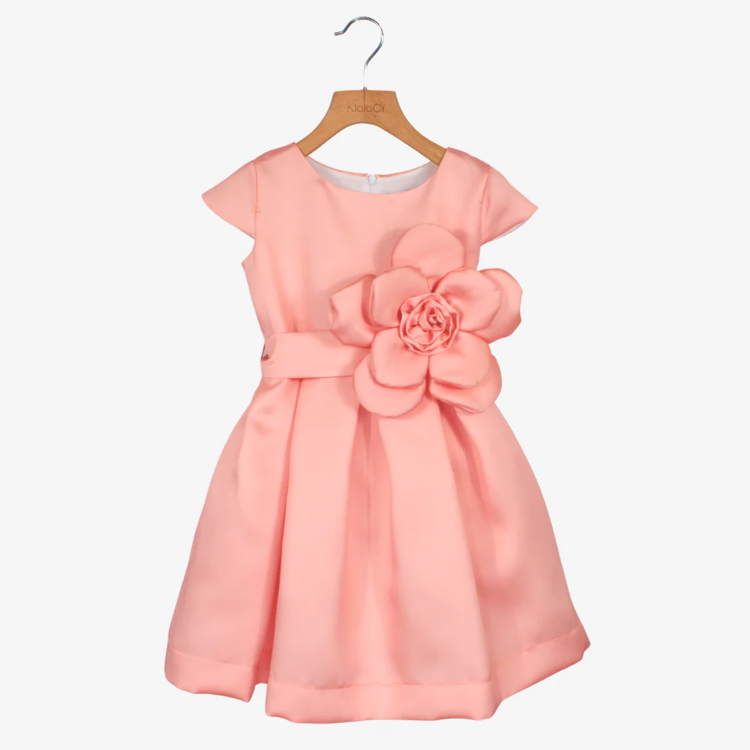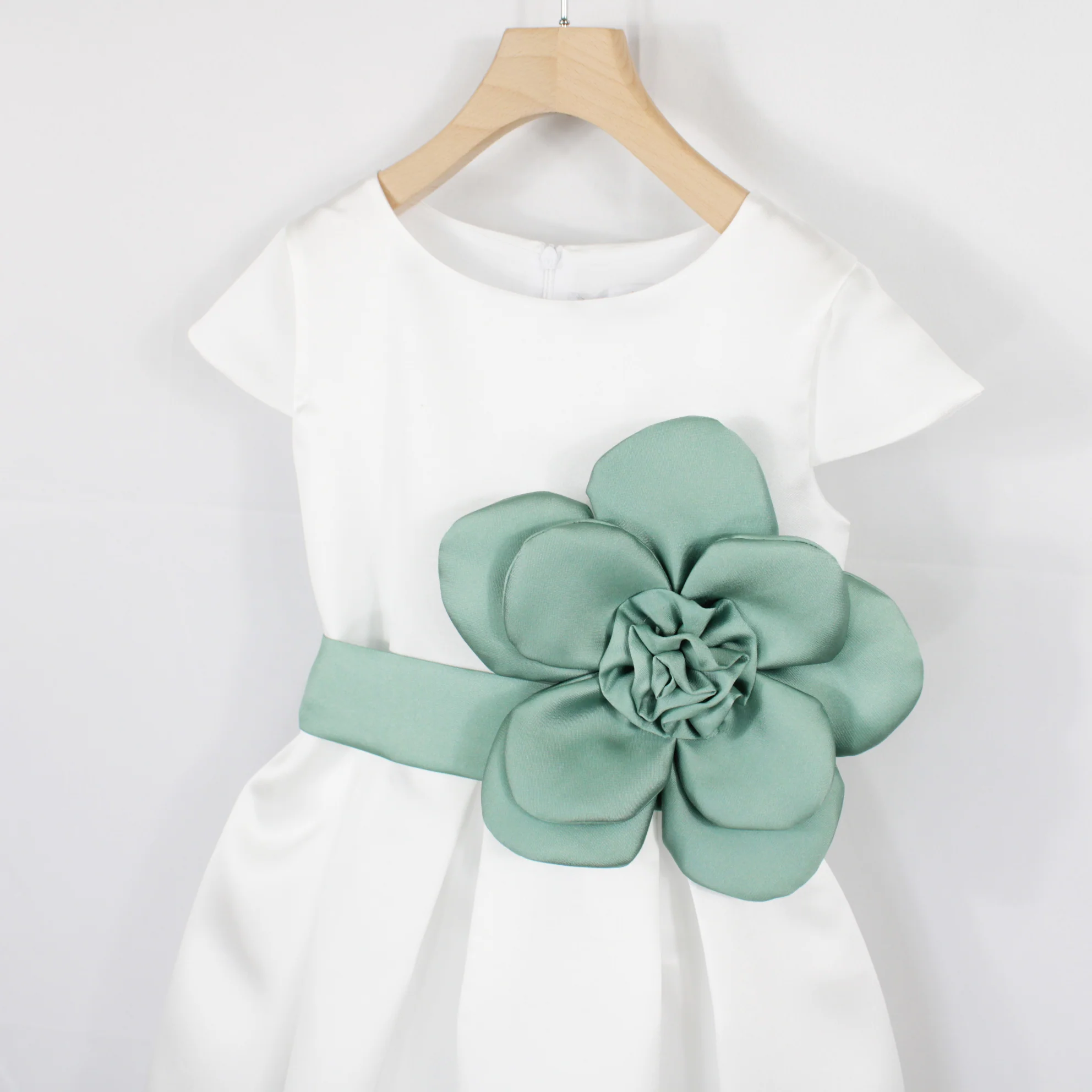 Elegante abito da cerimonia per bambine e ragazze, perfetto per occasioni speciali. Realizzato in mikado, offre una vestibilità raffinata e confortevole. La cintura è impreziosita da un ampio fiore applicato, aggiungendo un tocco di classe e romanticismo.
