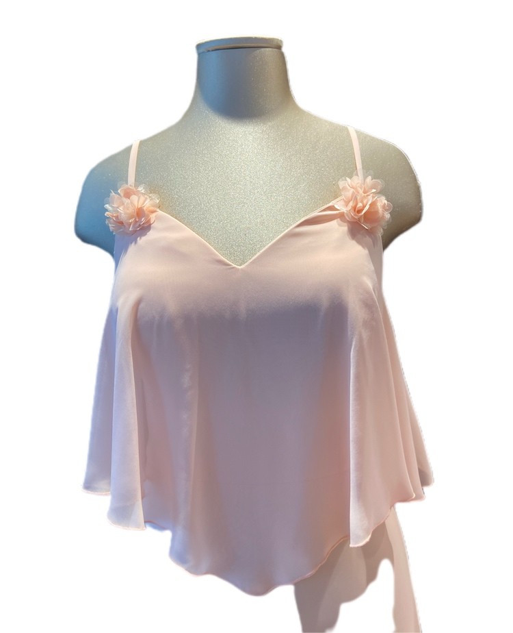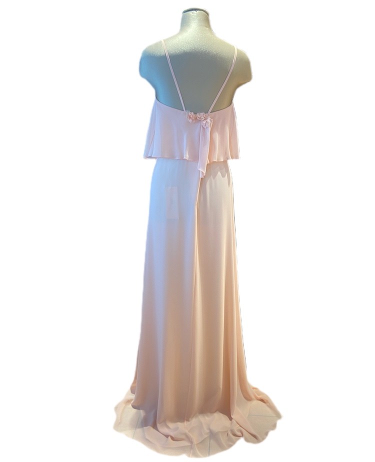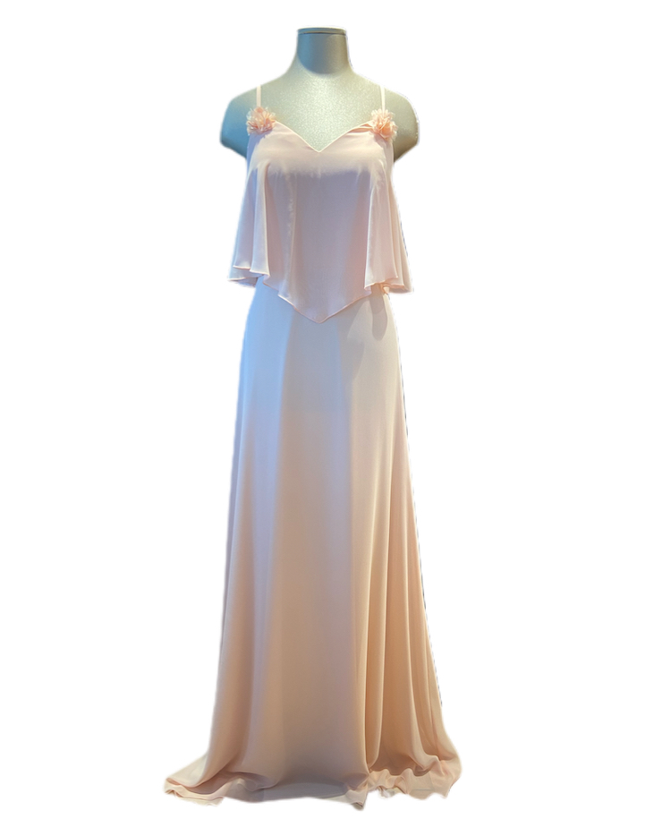 abito da damigella rosa cipria con particolare mantella sovrapposta.