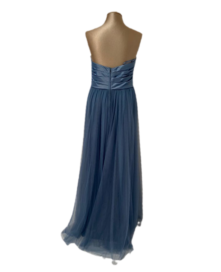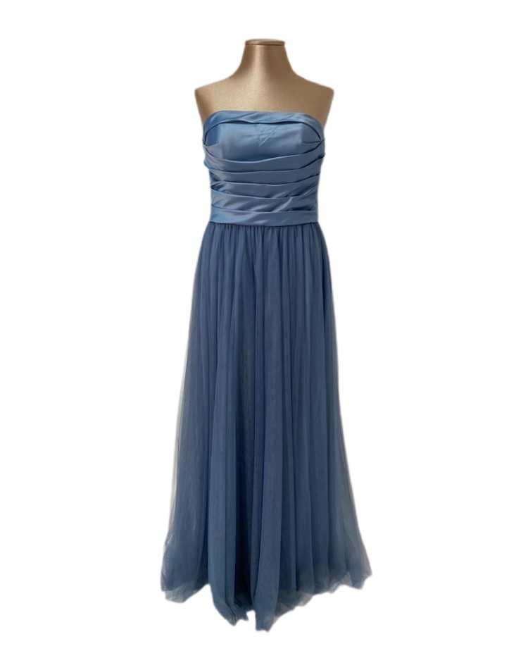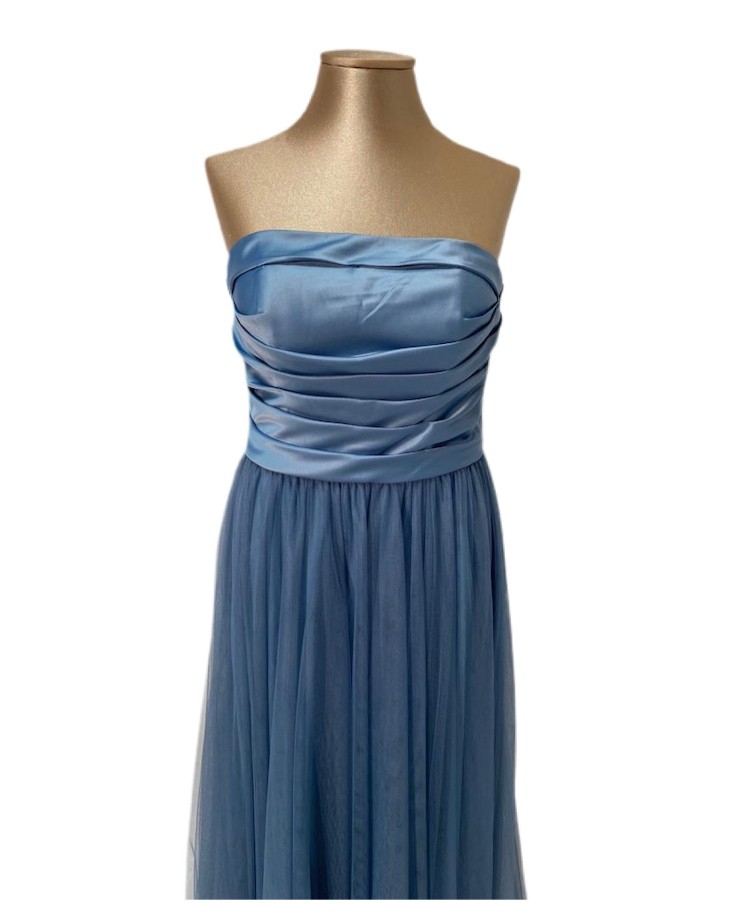 abito lungo color carta da zucchero, formato da corpetto in raso lucino con piegoline e gonna in tulle mano seta.