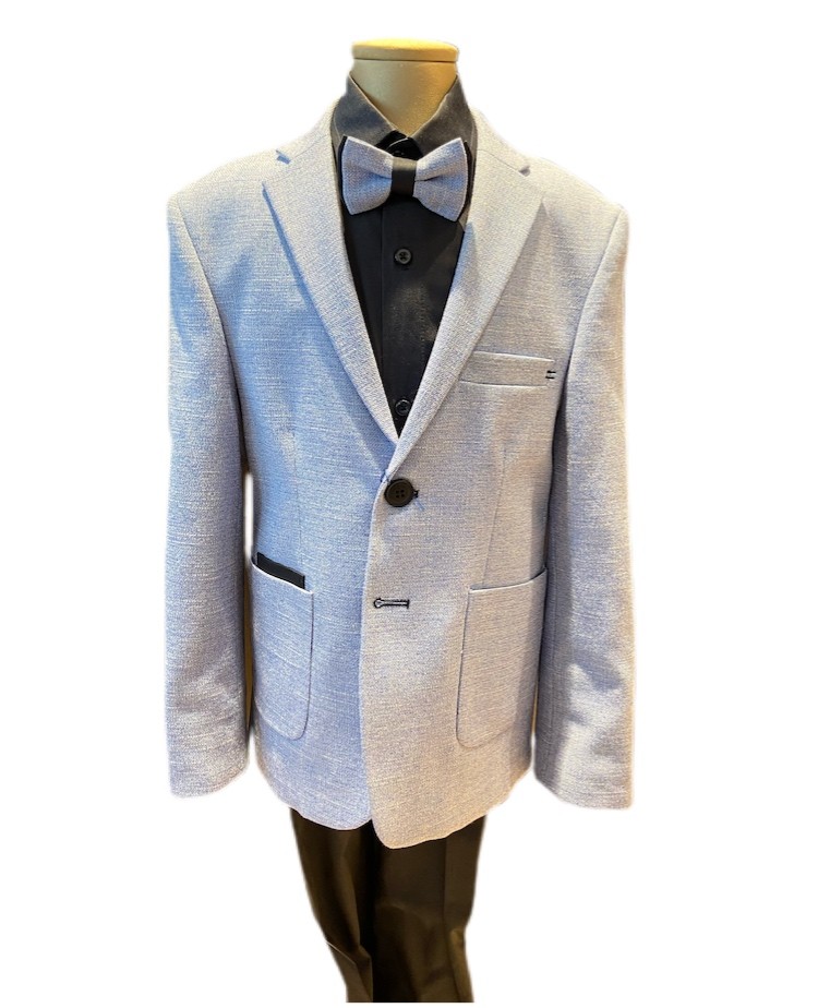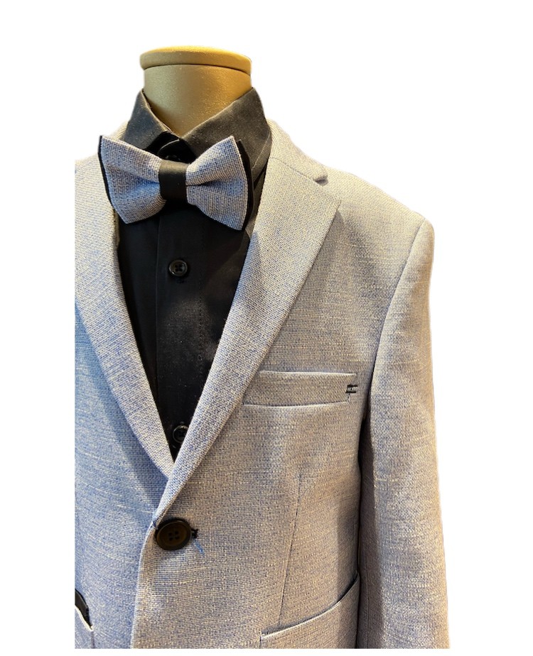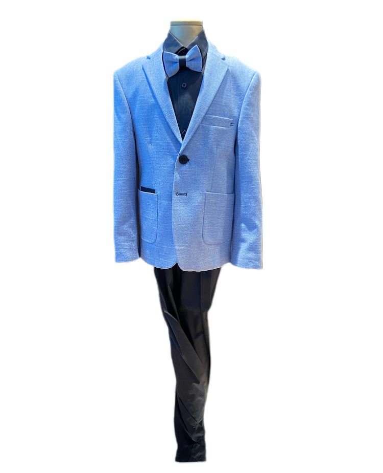 Abito paggetto composto da camicia e pantalone blu notte. Giacca e papillon color carta da zucchero.