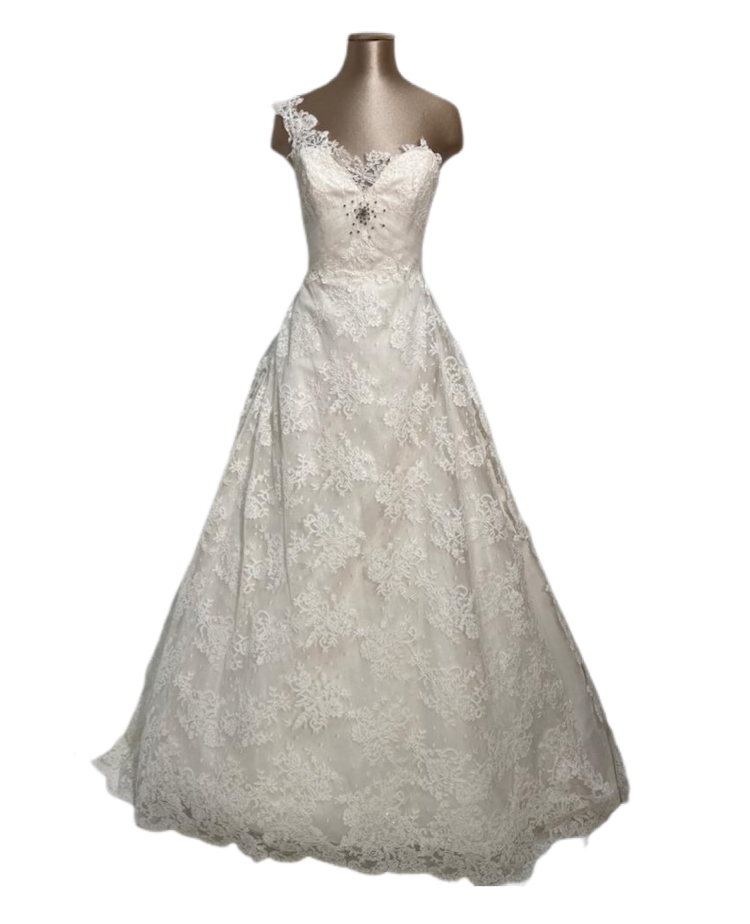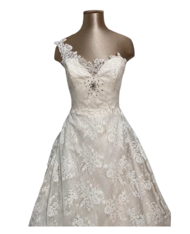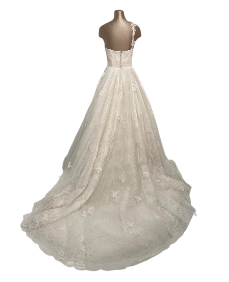 abito sposa line jillian,interamente in pizzo con coda sovra applivata in tulle e pizzo.