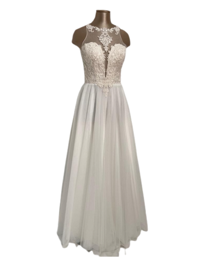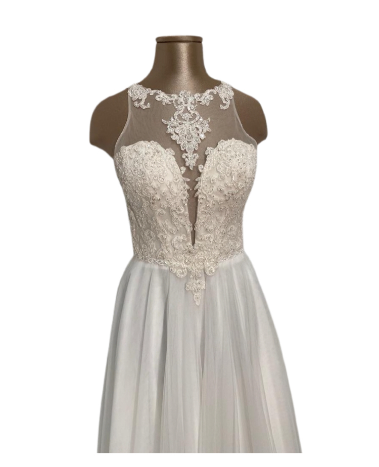 romantico abito con corpetto con scollo all’americana interamente in pizzo