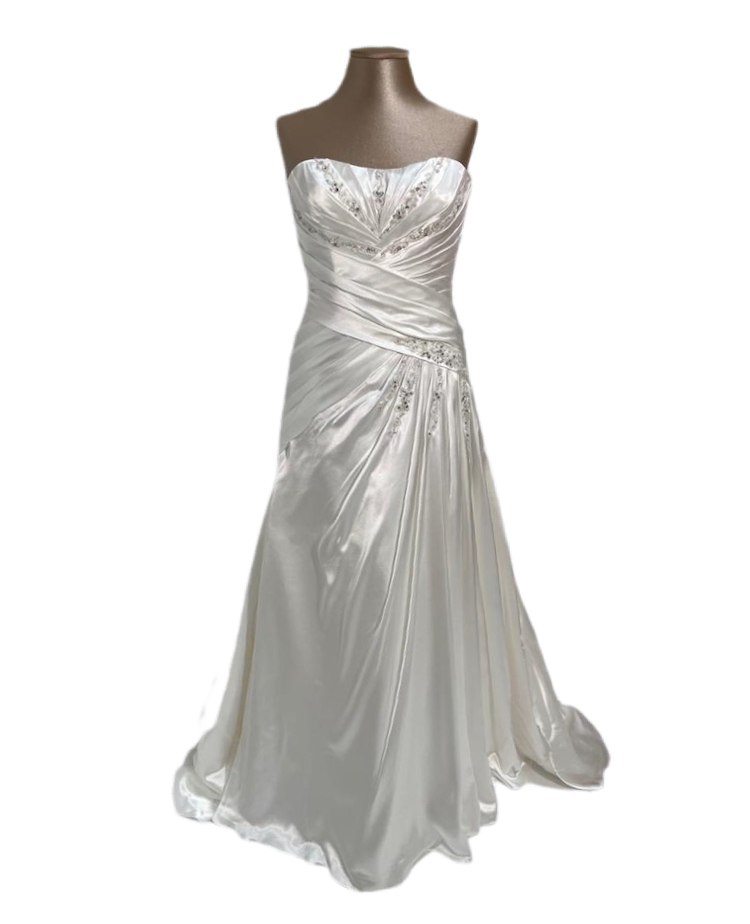 abito da sposa in raso lucido con ricami di cristalli sul corpetto e gonna