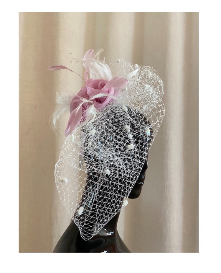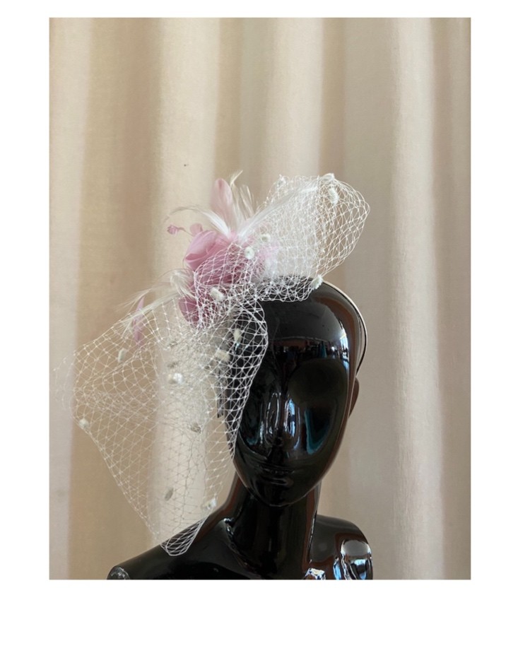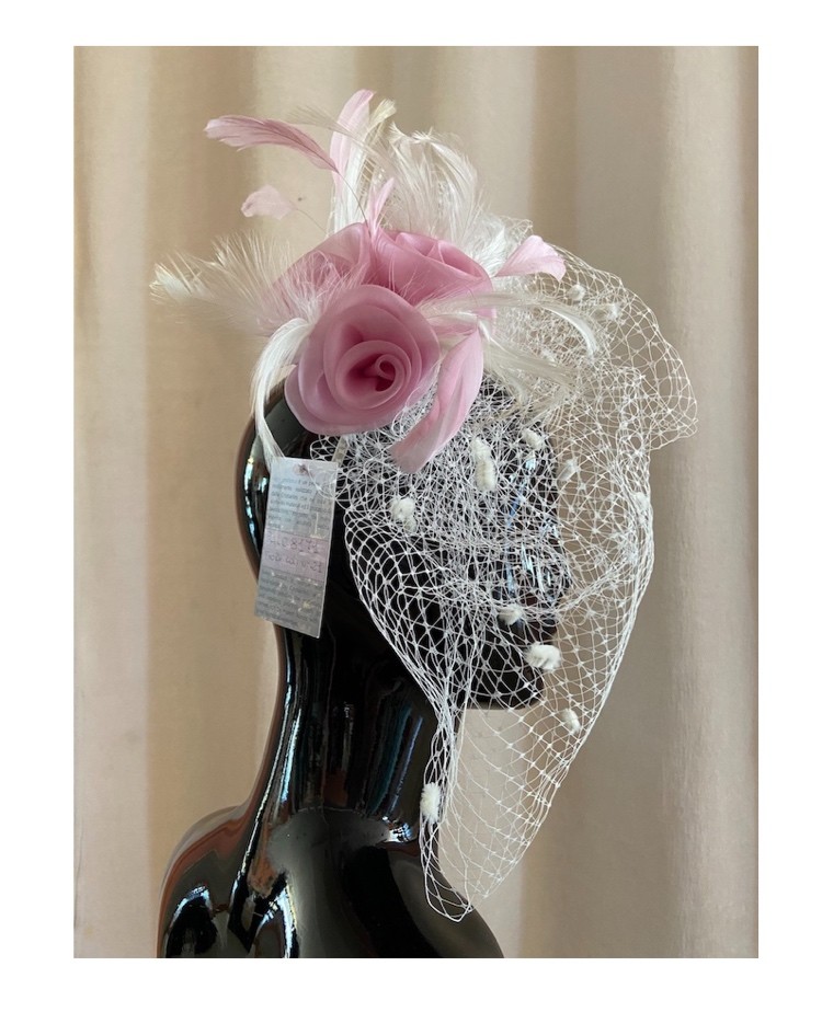 Cerchietto bianco con veletta e fiore rosa tendente al glicine.