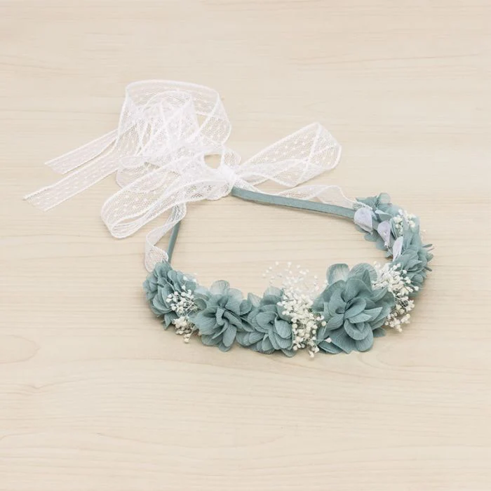 Fiori di 5,3 e 2 cm. ca. sulla fascia da 5 mm. ca. e striscia di 75 cm. ca. lungo fatta a mano