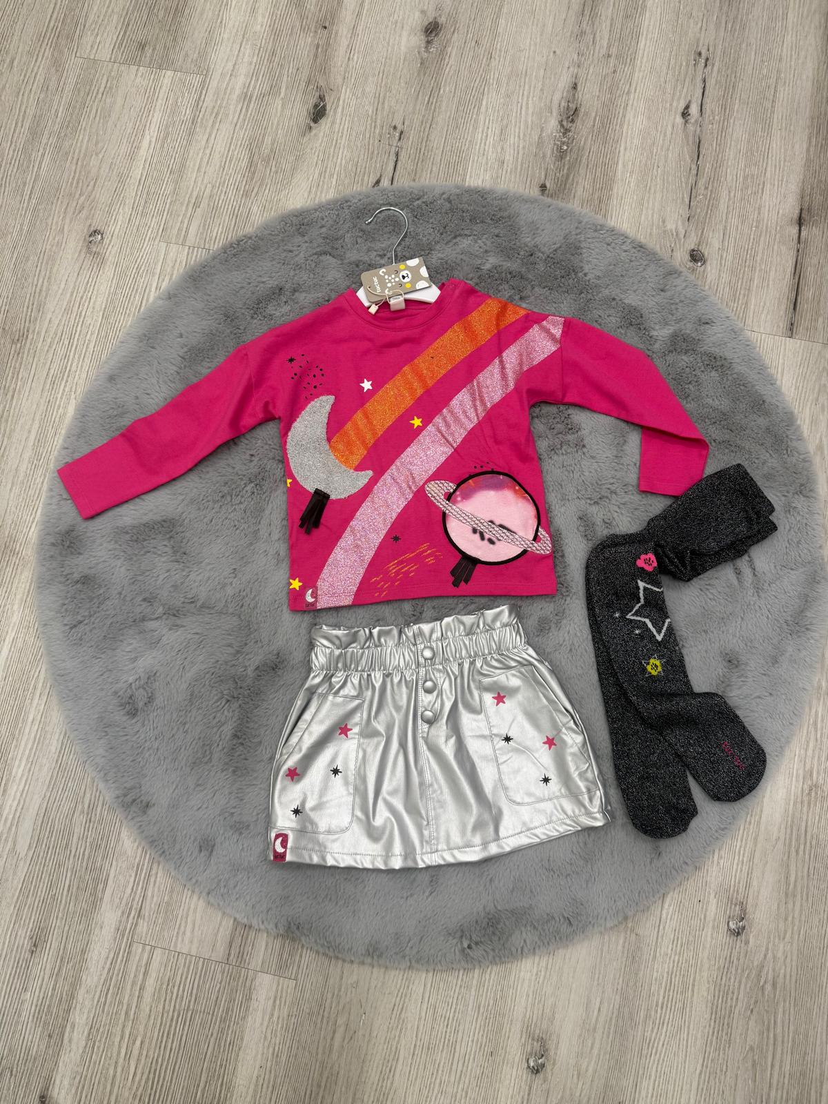 La maglia fucsia è decorata con una vivace fantasia a tema spazio: luna, pianeti, stelle e arcobaleni glitterati che donano luminosità e un tocco magico. La gonna color argento metallizzato, con vita elasticizzata e bottoncini decorativi frontali, aggiunge un look moderno e di tendenza, arricchito da piccole stelline stampate.
