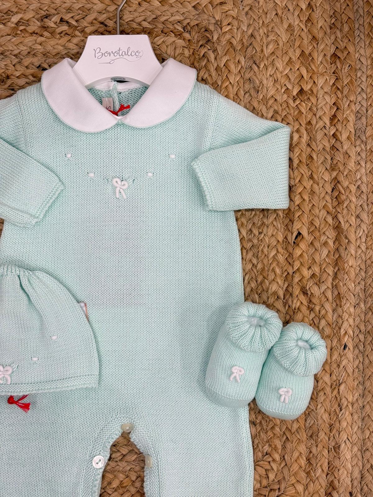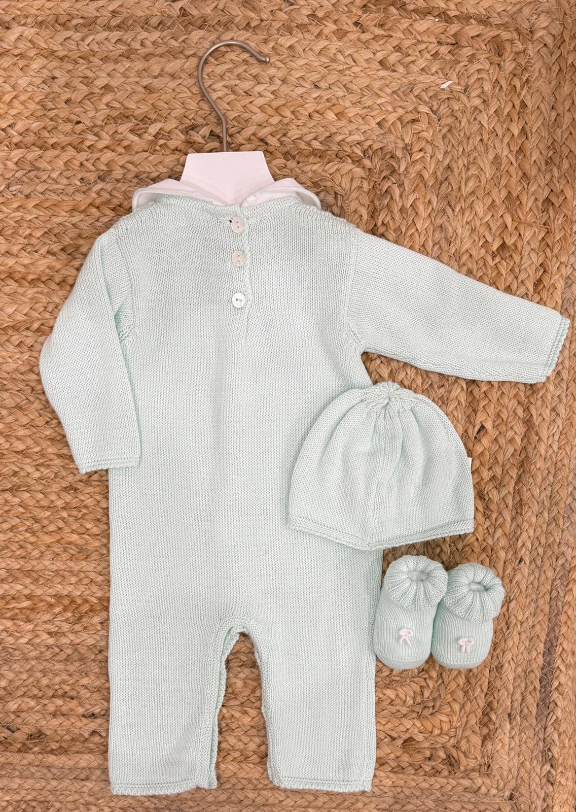 Completo con cappello e babbucce in filo, con ricamo a mano