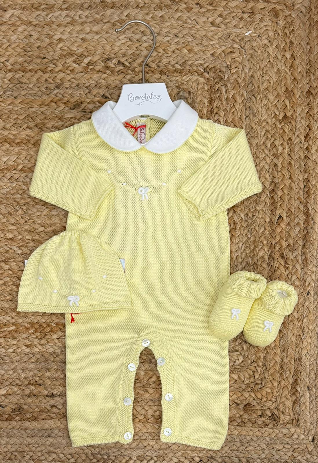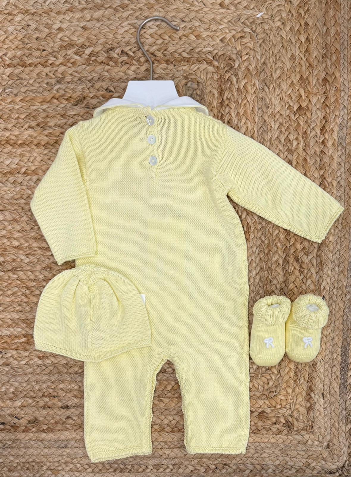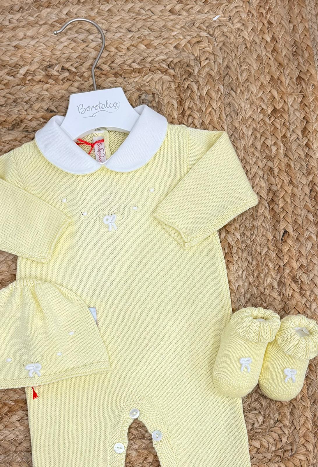 Completo con cappello e babbucce in filo, con ricamo a mano
