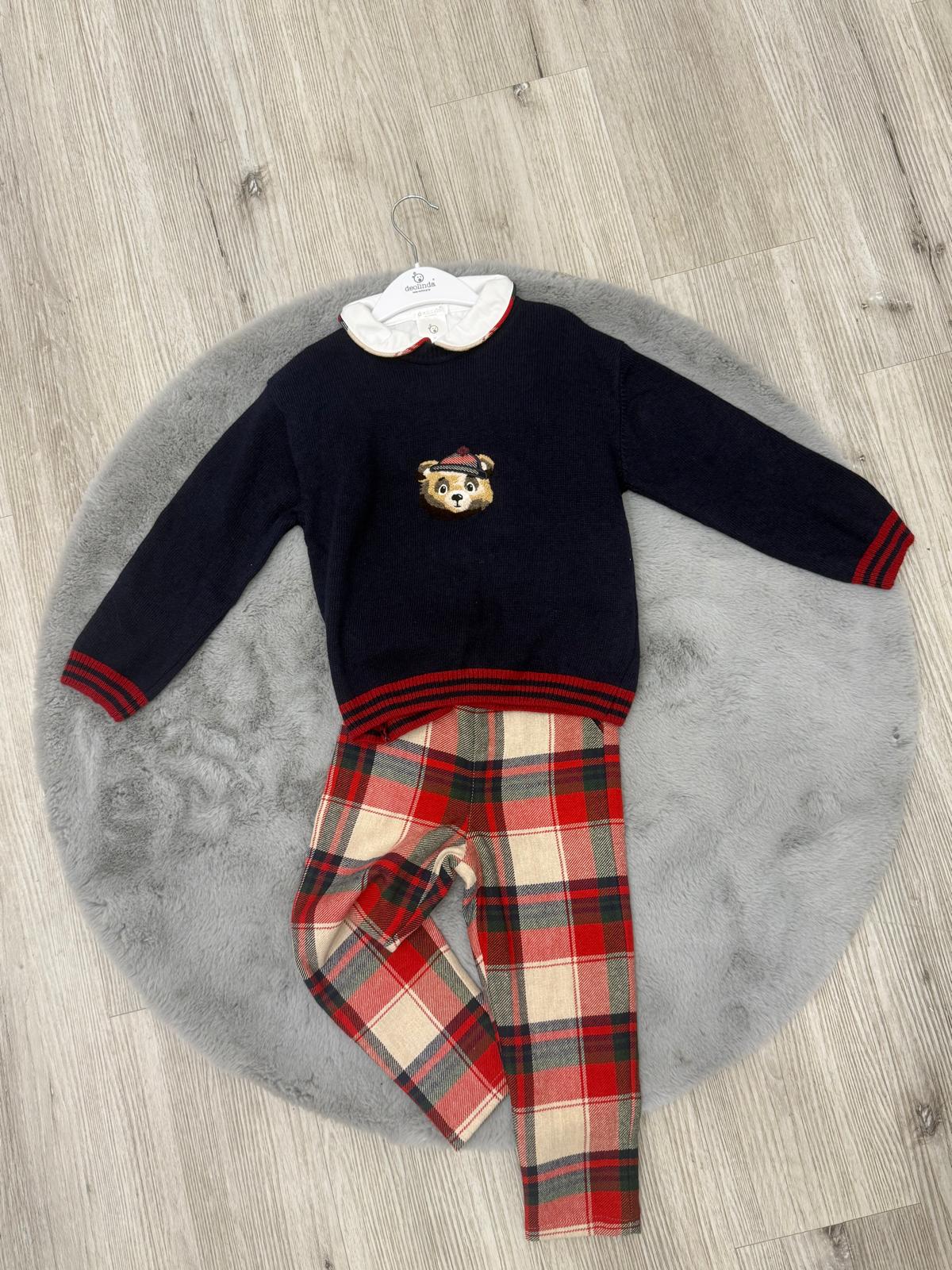 Un completo raffinato e dal gusto tradizionale, firmato Deolinda, pensato per i bimbi che amano indossare capi comodi senza rinunciare allo stile. L’abbinamento tra il maglioncino blu navy e i pantaloni tartan crea un look caldo, elegante e ideale per la stagione invernale e per le festività.