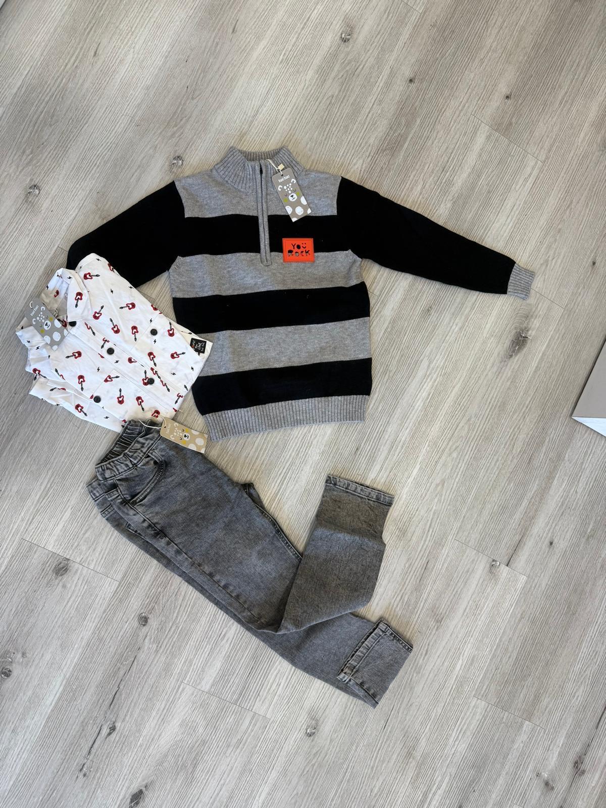Il maglioncino grigio e nero a righe presenta una pratica mezza zip e un’etichetta arancione “You Rock” che dona un tocco trendy e contemporaneo.