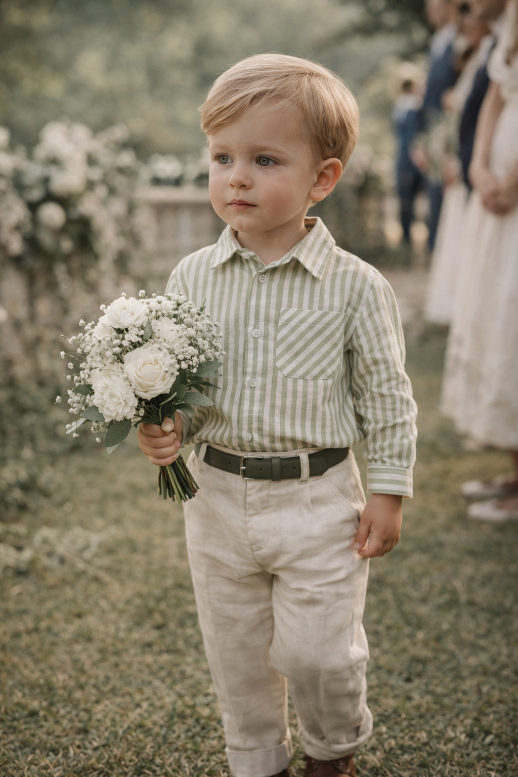 Raffinato completo bambino Bimbalò ideale per cerimonie ed eventi speciali. Il set è composto da una camicia a righe verticali verde salvia e bianco, realizzata in tessuto leggero e traspirante, con colletto classico, chiusura frontale con bottoni e taschino applicato sul petto. Le maniche lunghe possono essere comodamente risvoltate per un look più casual.