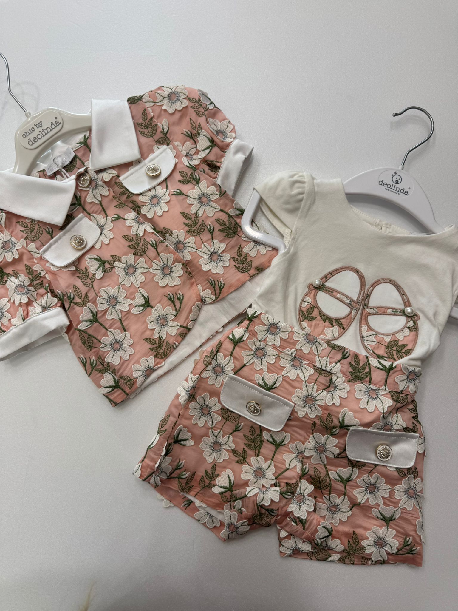 Delizioso completo bimba firmato Deolinda, caratterizzato da uno stile raffinato e romantico. Il set è composto da maglietta a maniche corte e pantaloncino coordinato, impreziositi da una delicata fantasia floreale nei toni del rosa cipria, verde e bianco.