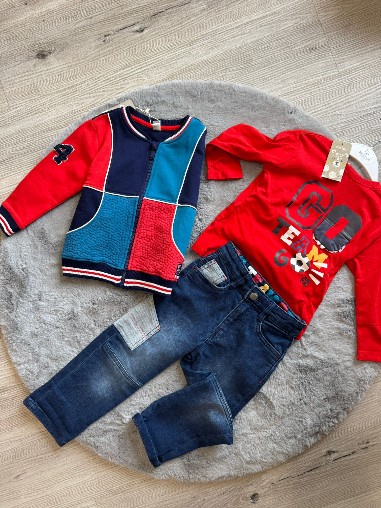 Completo bambino Tuc Tuc dal look sportivo e grintoso, ideale per i piccoli che amano muoversi in libertà con stile. Il set è composto da giacca, maglia e jeans, perfetti da indossare insieme o separatamente per creare outfit sempre diversi.