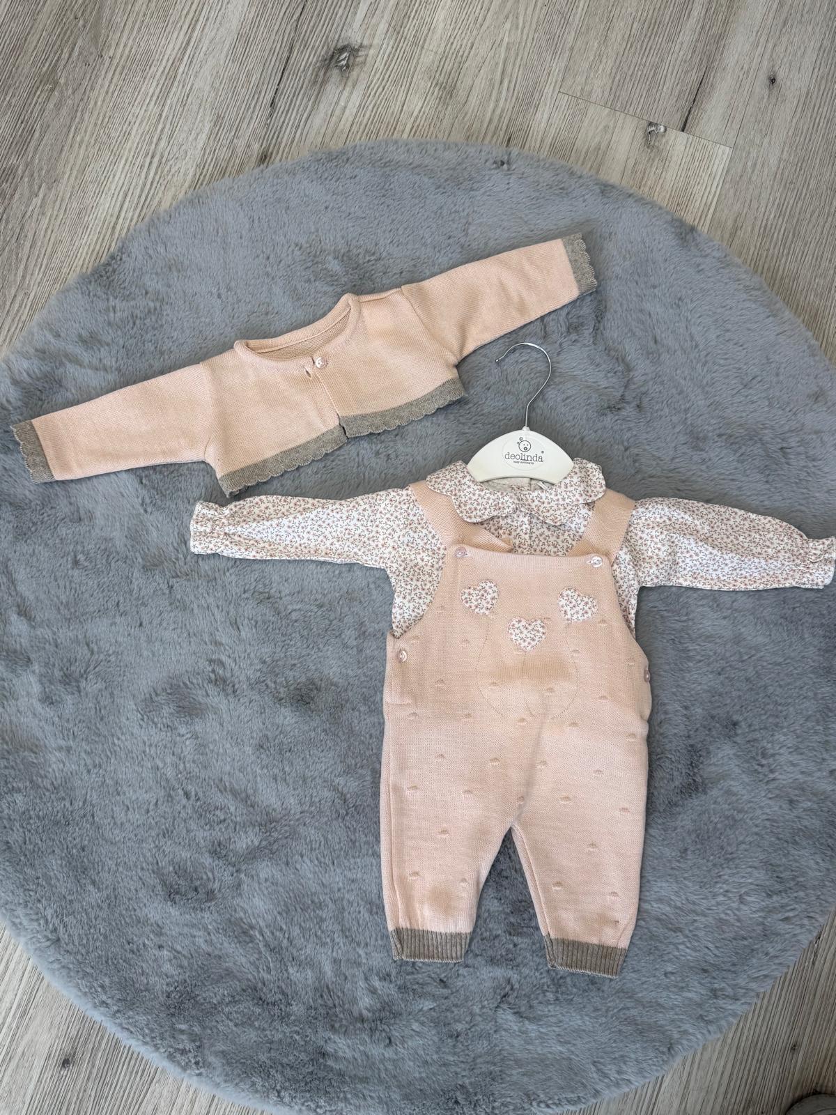 Raffinato coordinato per neonato firmato Deolinda, composto da salopette in maglia, camicina a fantasia floreale e cardigan abbinato. Un completo pensato per unire comfort, delicatezza e stile senza tempo.