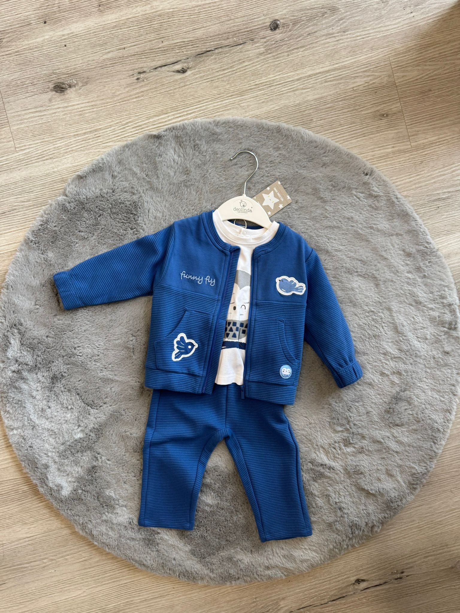 La giacchina presenta una chiusura frontale pratica, taschine applicate e simpatiche decorazioni a tema nuvolette e volo, che donano un tocco tenero e giocoso. La maglia completa il look con una stampa delicata, mentre il pantalone con elastico in vita assicura una vestibilità comoda e avvolgente.