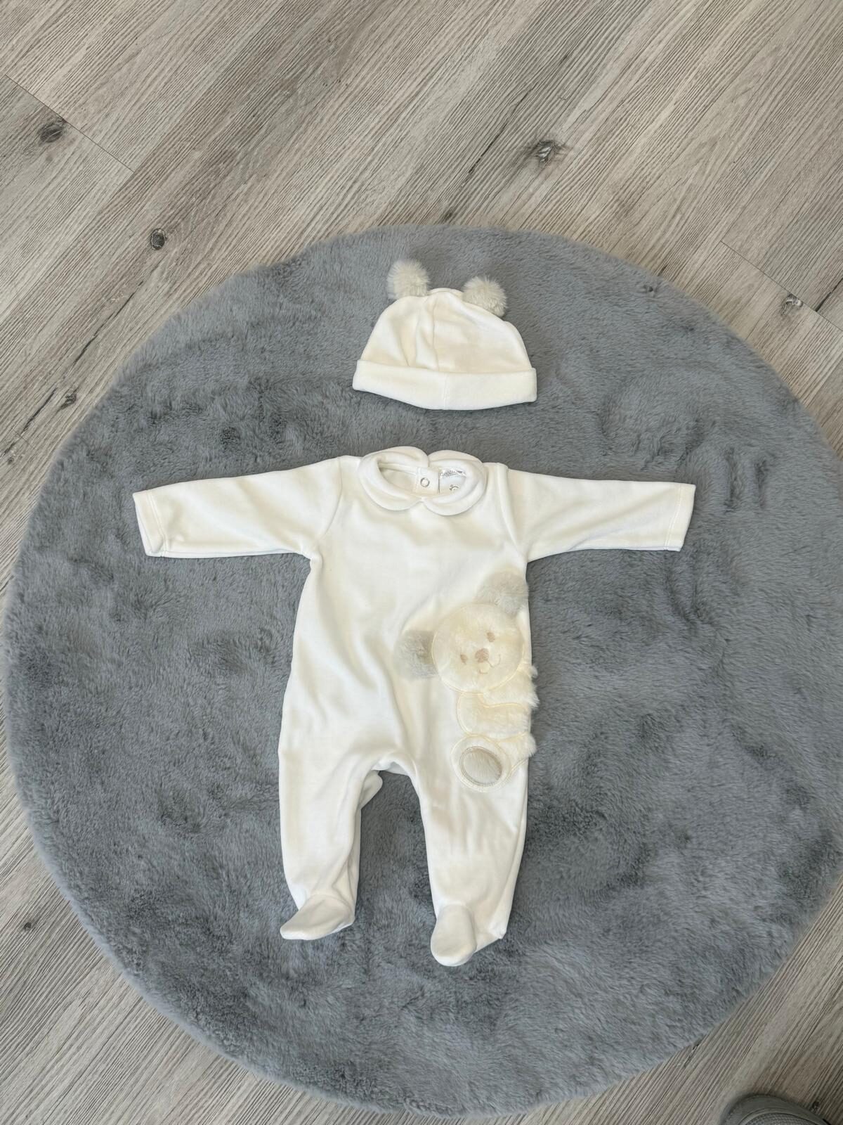 Completa il set il cappellino coordinato, con piccoli dettagli soffici, pensato per proteggere il neonato mantenendo uno stile armonioso e raffinato.