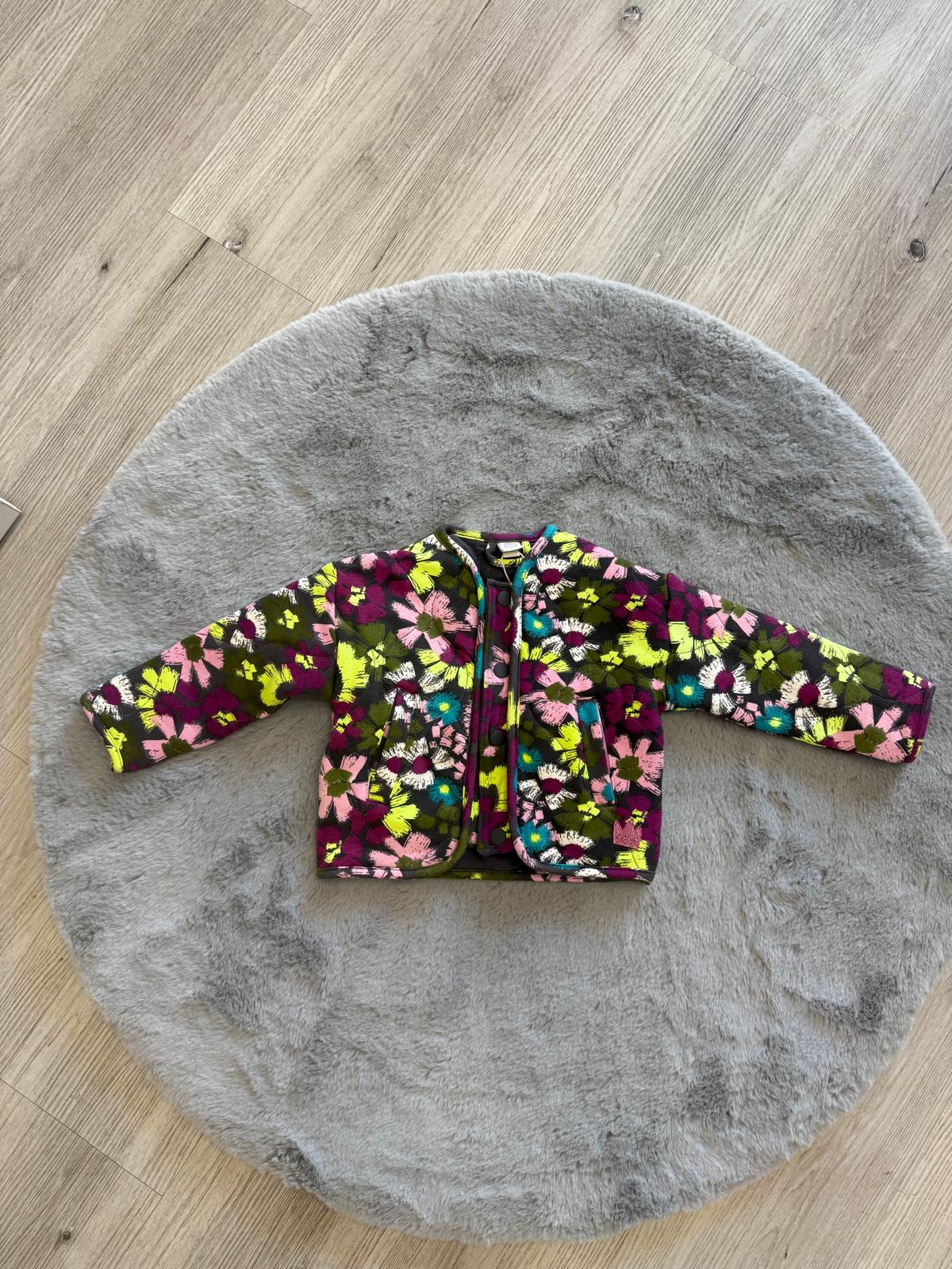 Vivace e originale giacca Tuc Tuc per bambina, realizzata in caldo cotone imbottito, ideale per proteggere dal fresco nelle mezze stagioni. Il capo si distingue per la sua fantasia floreale multicolor nei toni del fucsia, verde, giallo e rosa su fondo scuro, che dona un look allegro e moderno.