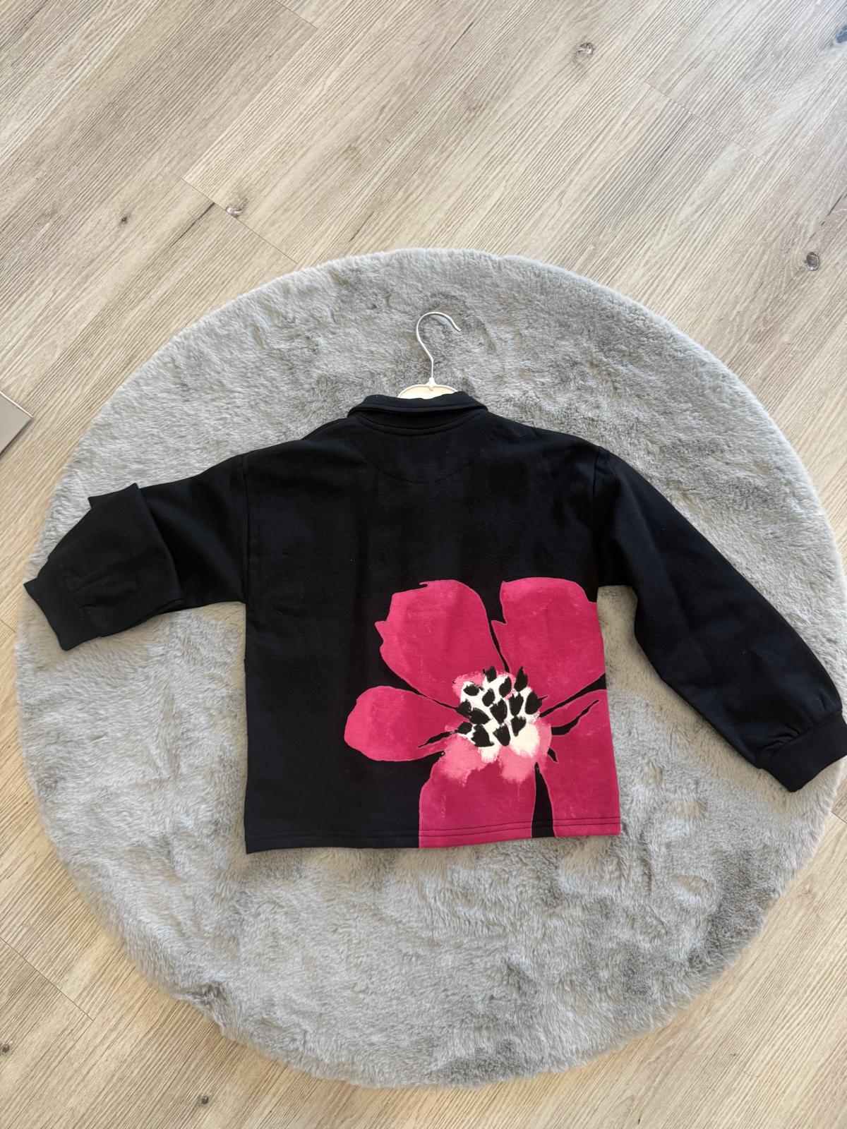 Il modello presenta chiusura frontale con bottoni a forma di cuore, colletto classico e tasche applicate sul davanti, pratiche e funzionali. Il design minimal sul fronte è arricchito da piccoli dettagli curati, mentre il retro è impreziosito da una maxi stampa floreale color fucsia, vivace e d’impatto, che rende il capo unico e riconoscibile.