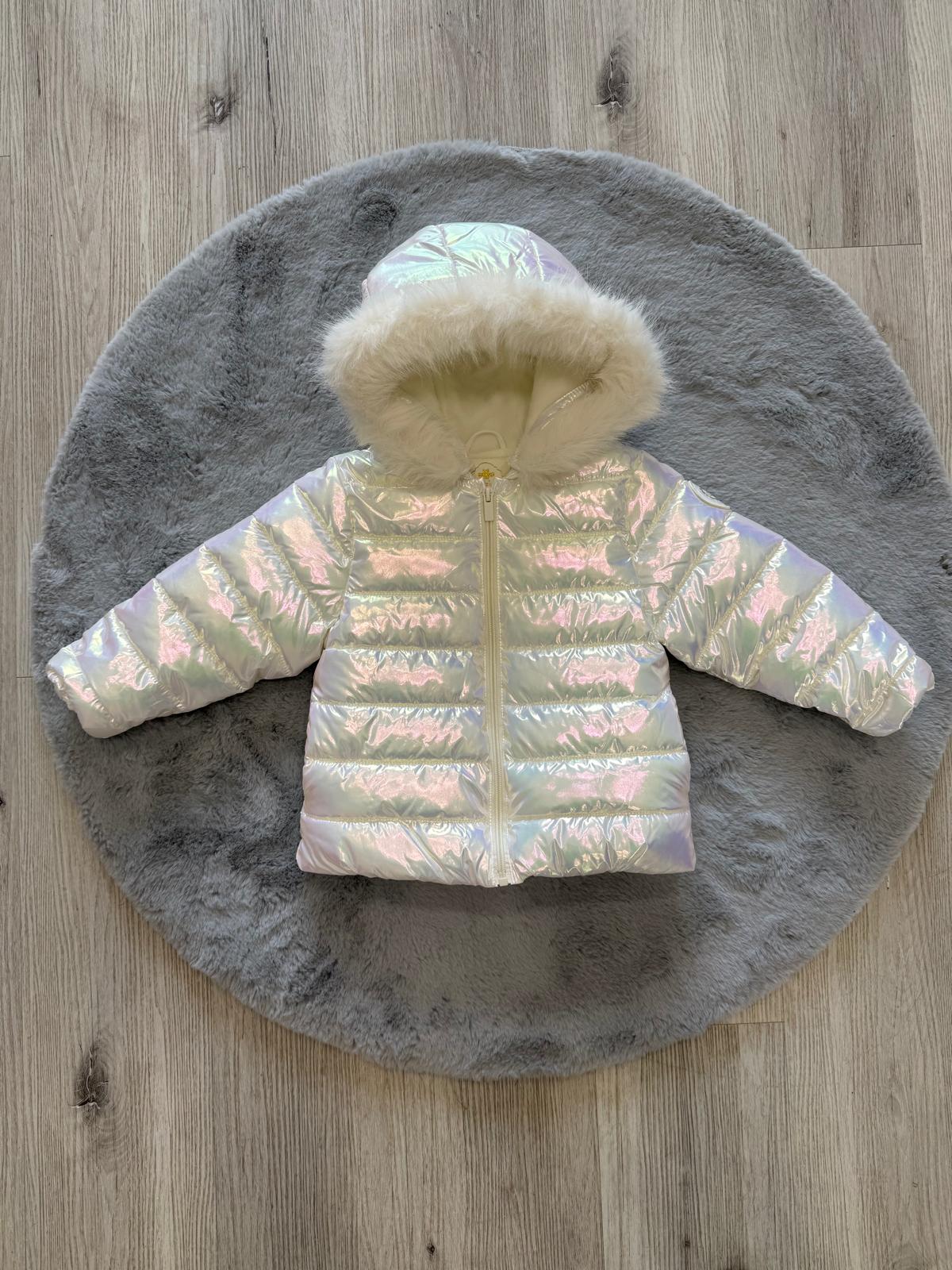 Raffinato giubbino imbottito per bambina, ideale per affrontare l’inverno con stile ed eleganza. Il modello è realizzato in tessuto lucido effetto perlato/iridescente color avorio, che riflette delicatamente la luce donando un look moderno e sofisticato. Dotato di cappuccio con morbido bordo in eco-pelliccia, garantisce calore e comfort nelle giornate più fredde.