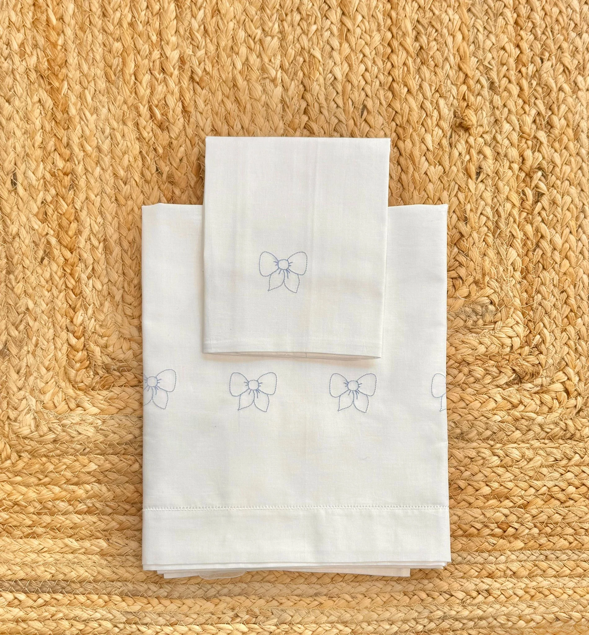 Il set lenzuola e adatto sia per culla piccola che per carrozzina è formato da: federa per cuscino e lenzuolino. Il lenzuolino è impreziosito da ricami. Il set ha una composizione di puro cotone 100%. Misura:90x120cm
