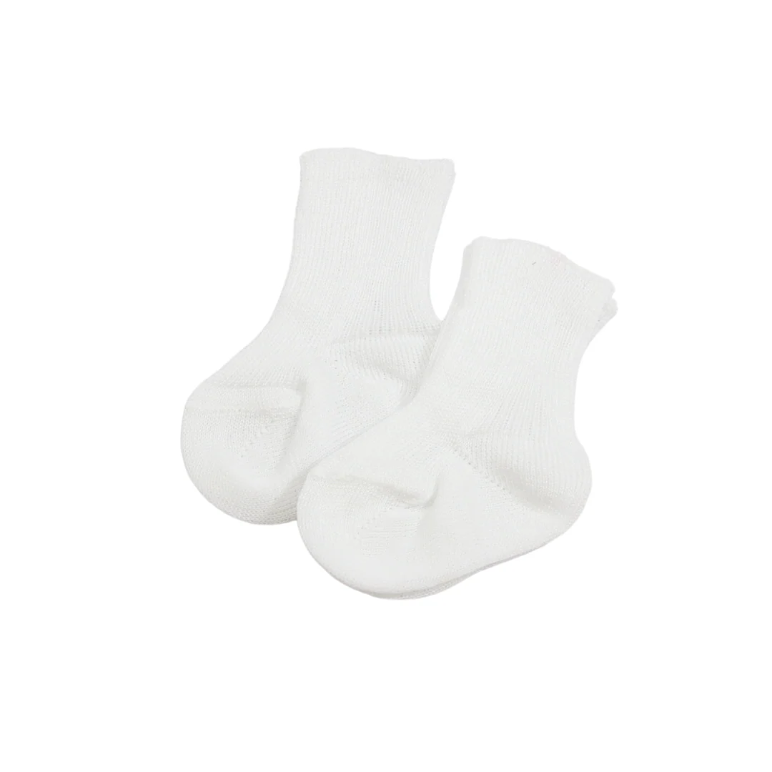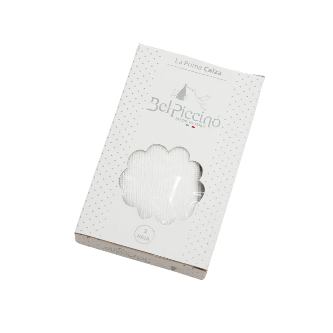 Le prime calze per neonati e neonate sono realizzate in filo di cotone senza elastico e con risvolti. Ogni confezione contiene due paia, confezionate singolarmente in scatole. Disponibili in bianco, sono composte al 100% da cotone e sono prodotte in Italia.