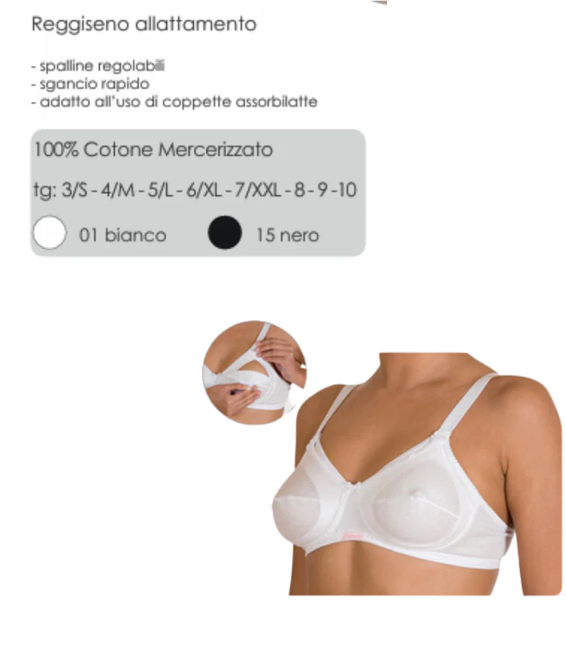 Guida alle taglie Reggiseno allattamentospalline regolabili, sgancio rapido,adatto all’uso di coppette assorbilatte Colore: bianco Taglia : 3/S – 4/M – 5/L – 6/XL – 7/XXL – 8 – 9 – 10 100% Cotone Mercerizzato