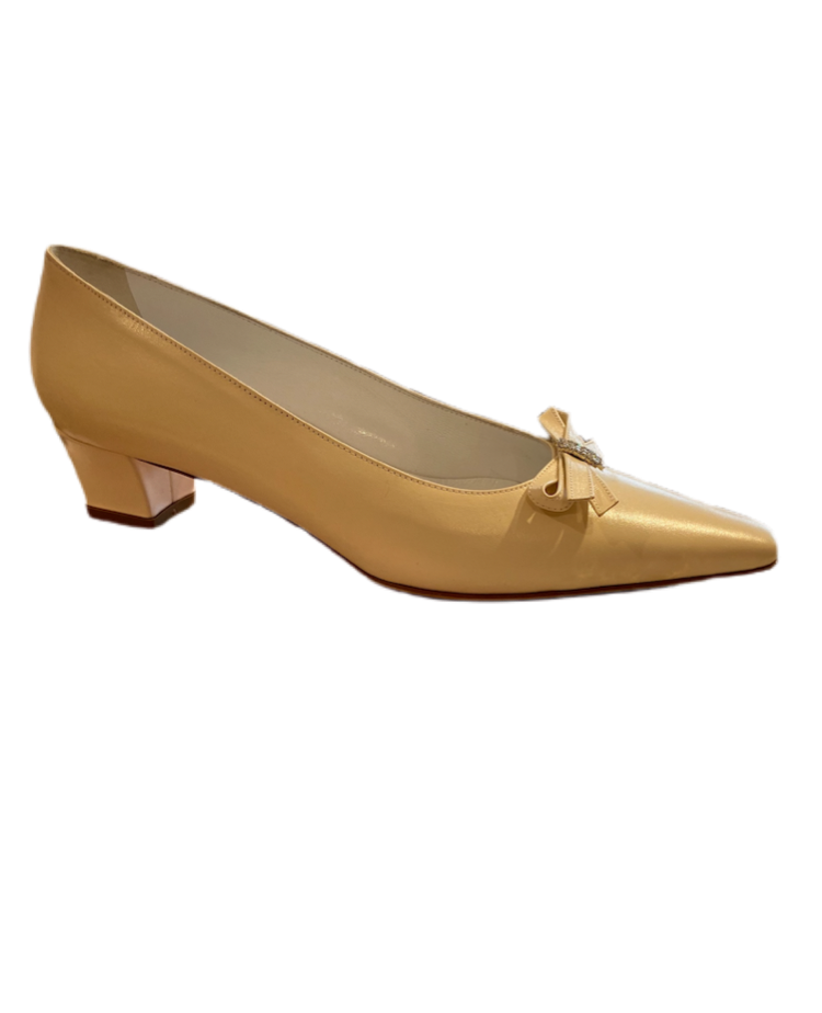Scarpa tacco basso per signora con fiocco. Materiale capretto morbido e avvolgente.