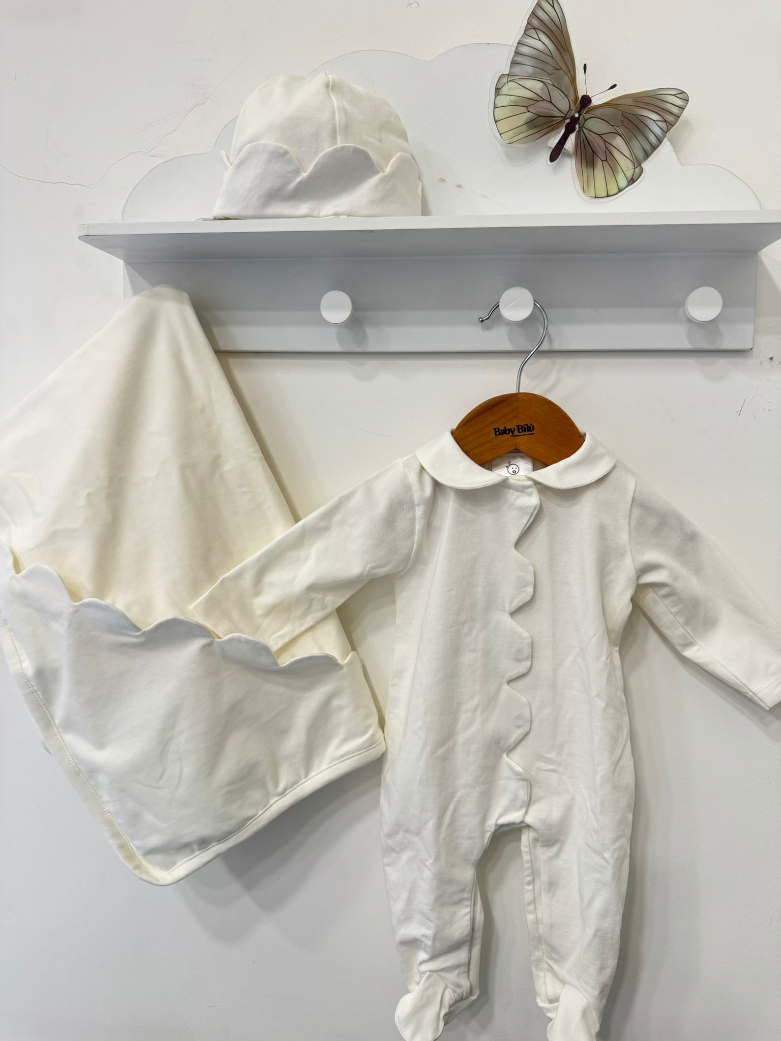 Box Deolinda bianca – 3 pz cappellino + tutina + copertina – cotone 100% italiano