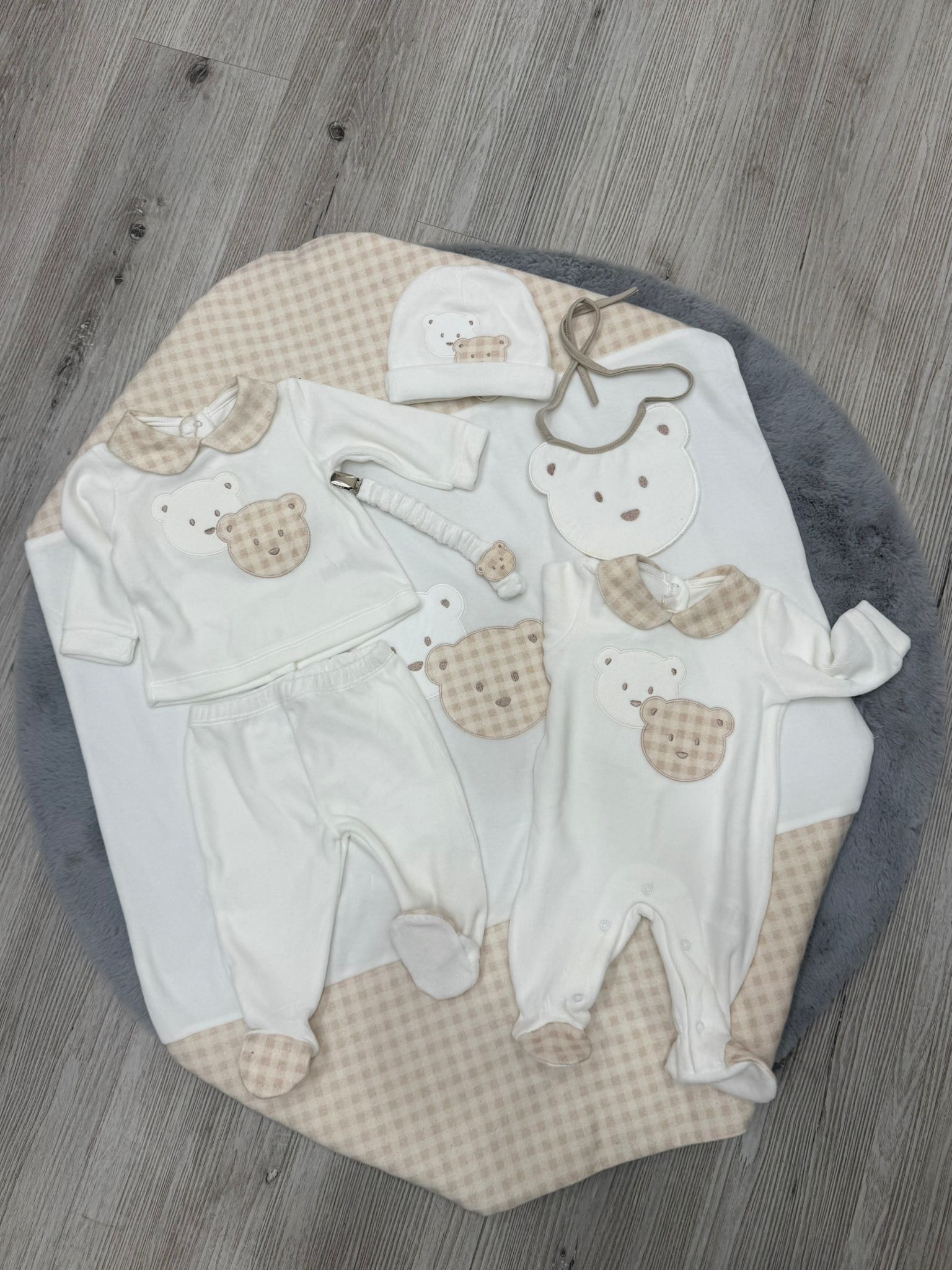Raffinato set nascita e uscita 5 pezzi, pensato per accogliere il neonato con stile, comfort e dolcezza. Le delicate tonalità bianco latte e beige con tenera applicazione orsetto rendono questo coordinato perfetto come primo corredino o come regalo nascita elegante.