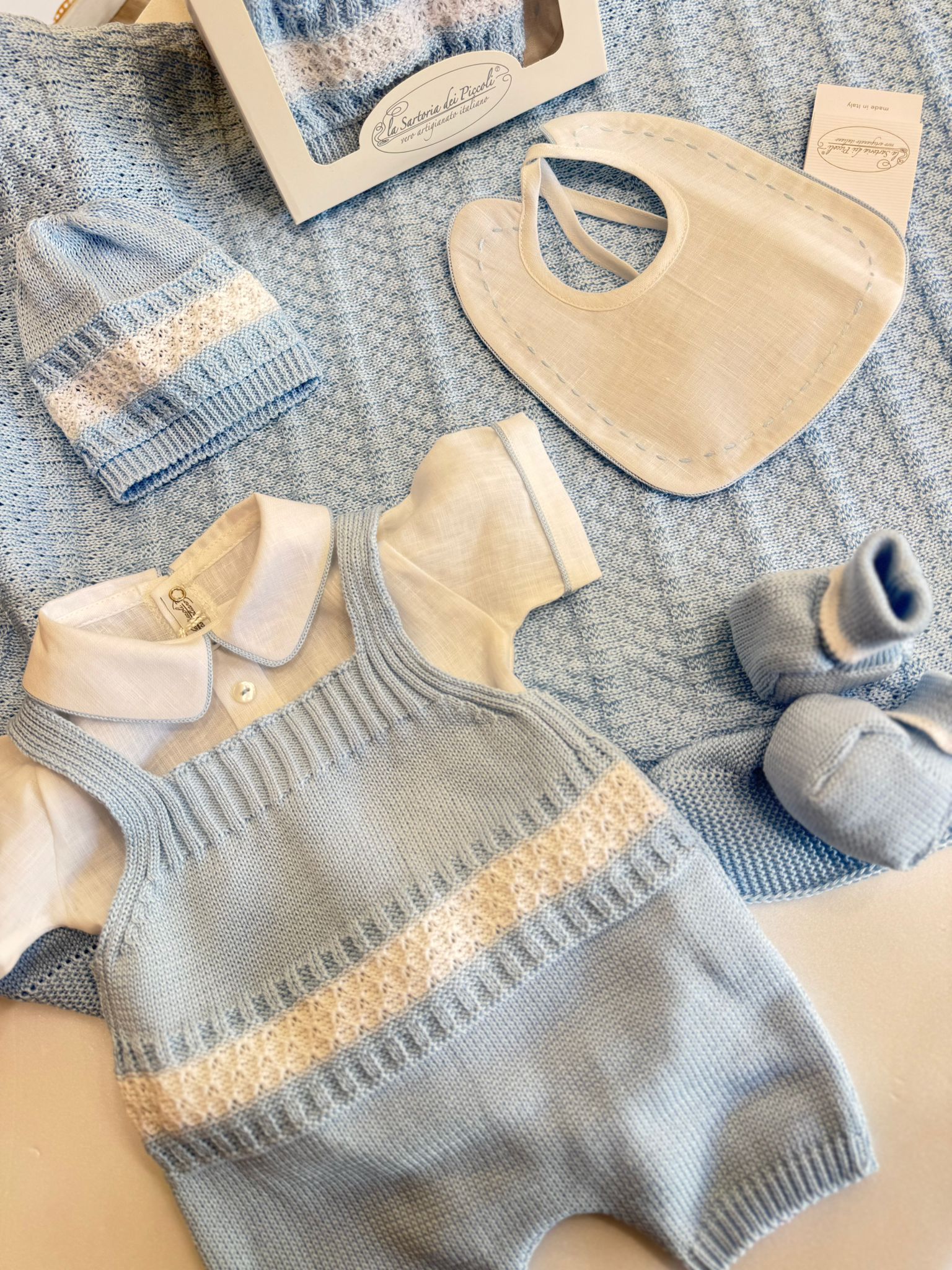 Set corredino nascita e uscita neonato – 5pz copertina + pagliaccetto + scarpette + bavette + cappellino realizzati in puro filo e lino 100% italiani – La Sartoria Dei Piccoli