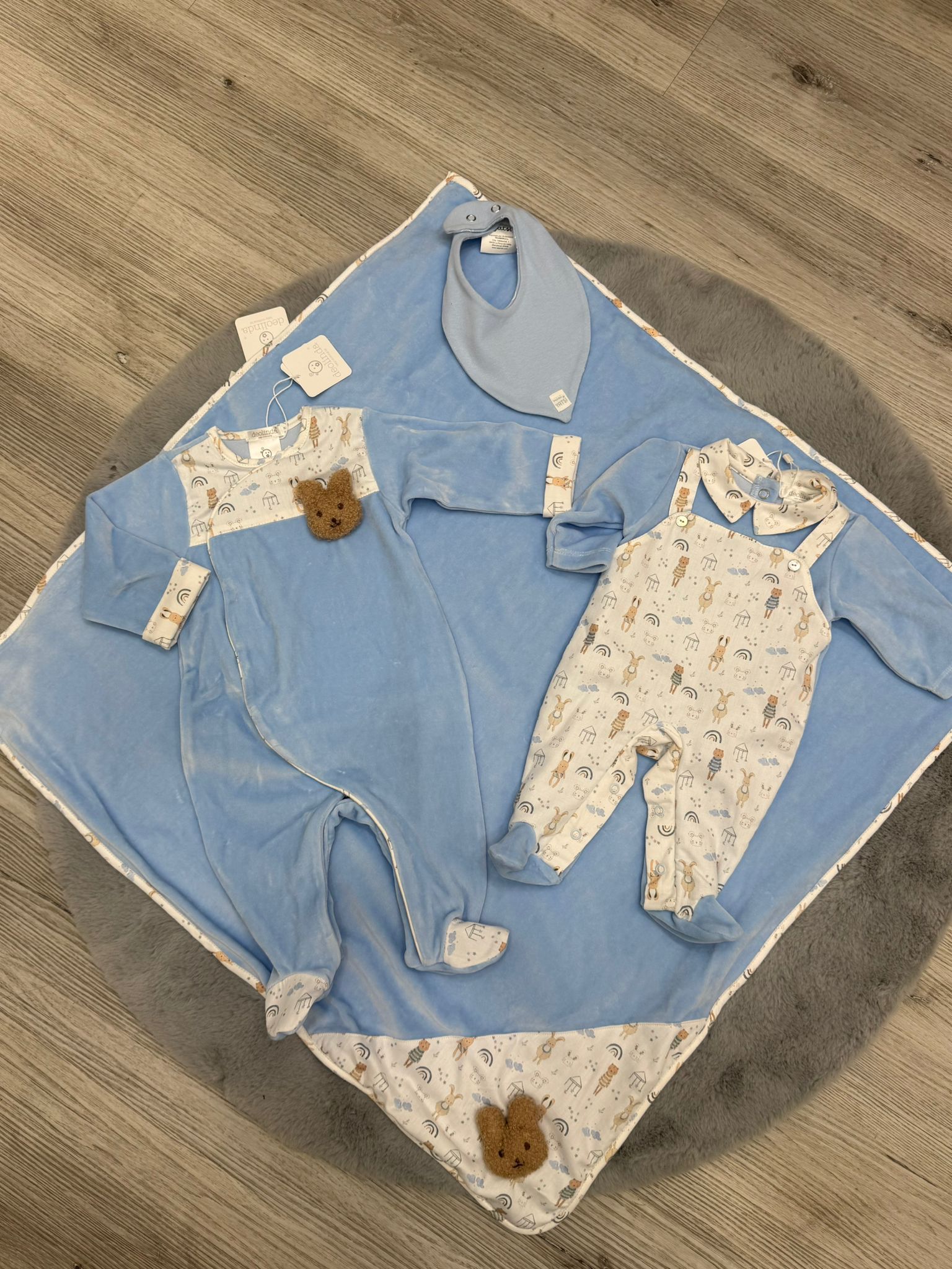 Dolce, raffinato e avvolgente, il set nascita e uscita Dolinda in ciniglia è pensato per accogliere il neonato con il massimo comfort nei suoi primi momenti speciali. La delicata tonalità azzurro polvere, abbinata alla fantasia con teneri animaletti, rende questo coordinato elegante e curato in ogni dettaglio.