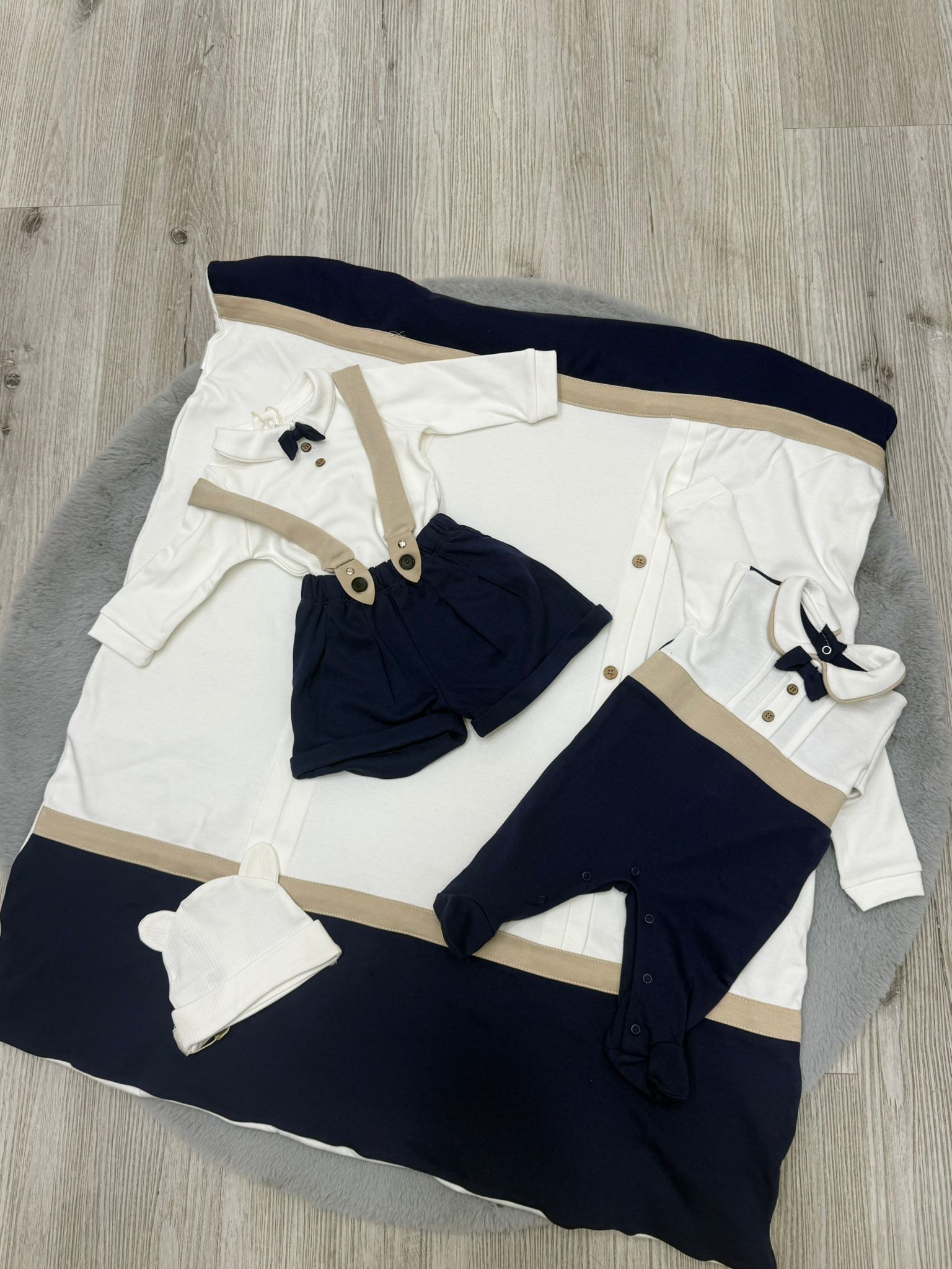 Raffinato set coordinato per neonato, ideale per i primi giorni di vita e per l’uscita speciale. Le delicate tonalità bianco latte, blu navy e beige donano uno stile senza tempo, perfetto per chi ama l’eleganza classica anche nei dettagli.
