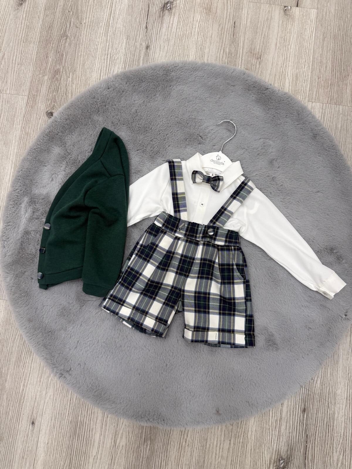 Un set raffinato e irresistibile, pensato per vestire il tuo bimbo con stile nelle occasioni speciali. Questo completo unisce un pagliaccetto elegante in fantasia tartan a un caldo cardigan verde bosco, creando un outfit completo e coordinato.