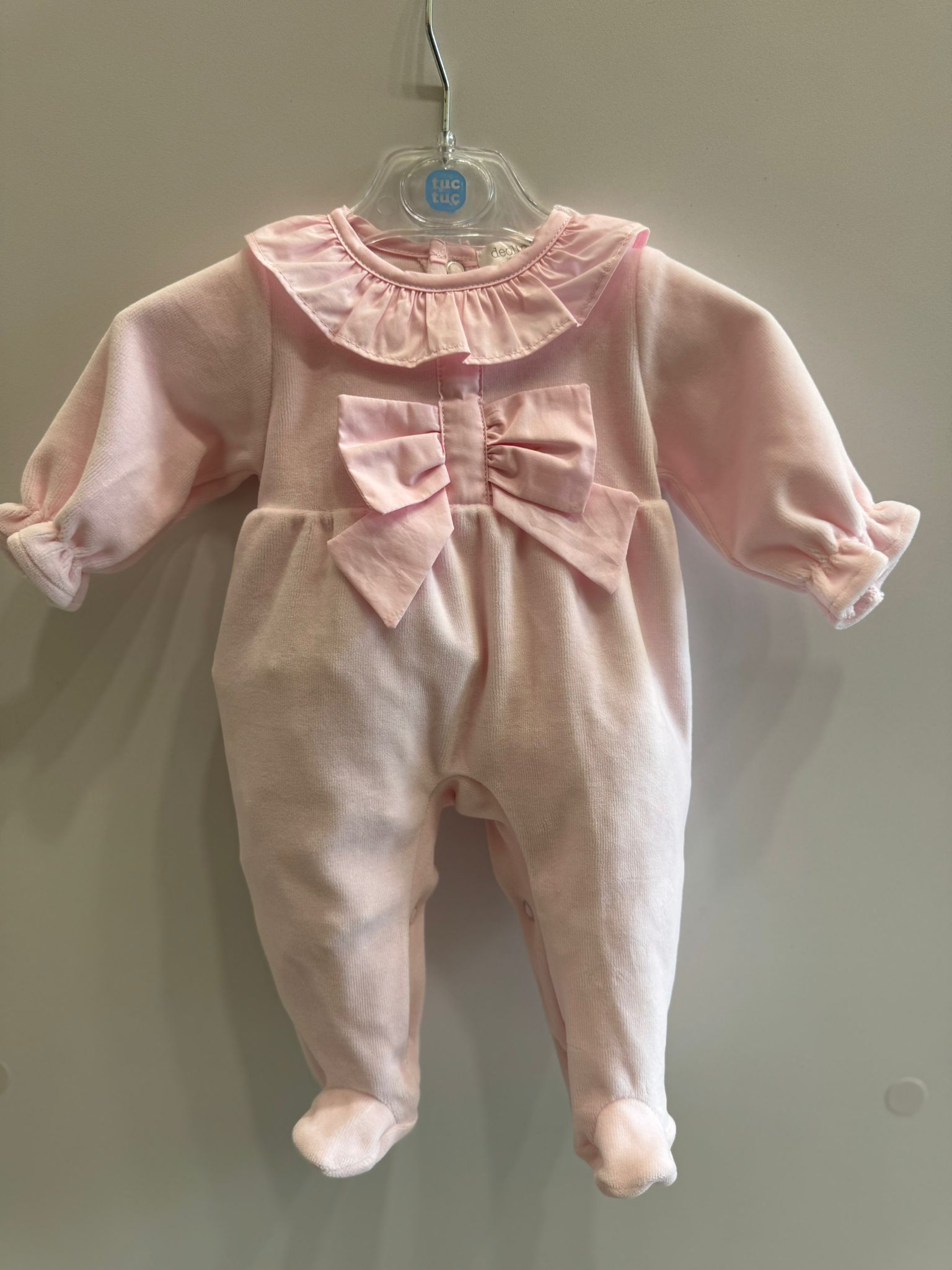Delicata e raffinata, questa tutina Deolinda è realizzata in morbido cotone color rosa cipria, ideale per avvolgere la neonata con comfort e dolcezza. Il modello presenta un elegante colletto arricciato e un romantico fiocco applicato sul davanti, dettaglio iconico che dona un tocco chic e senza tempo.